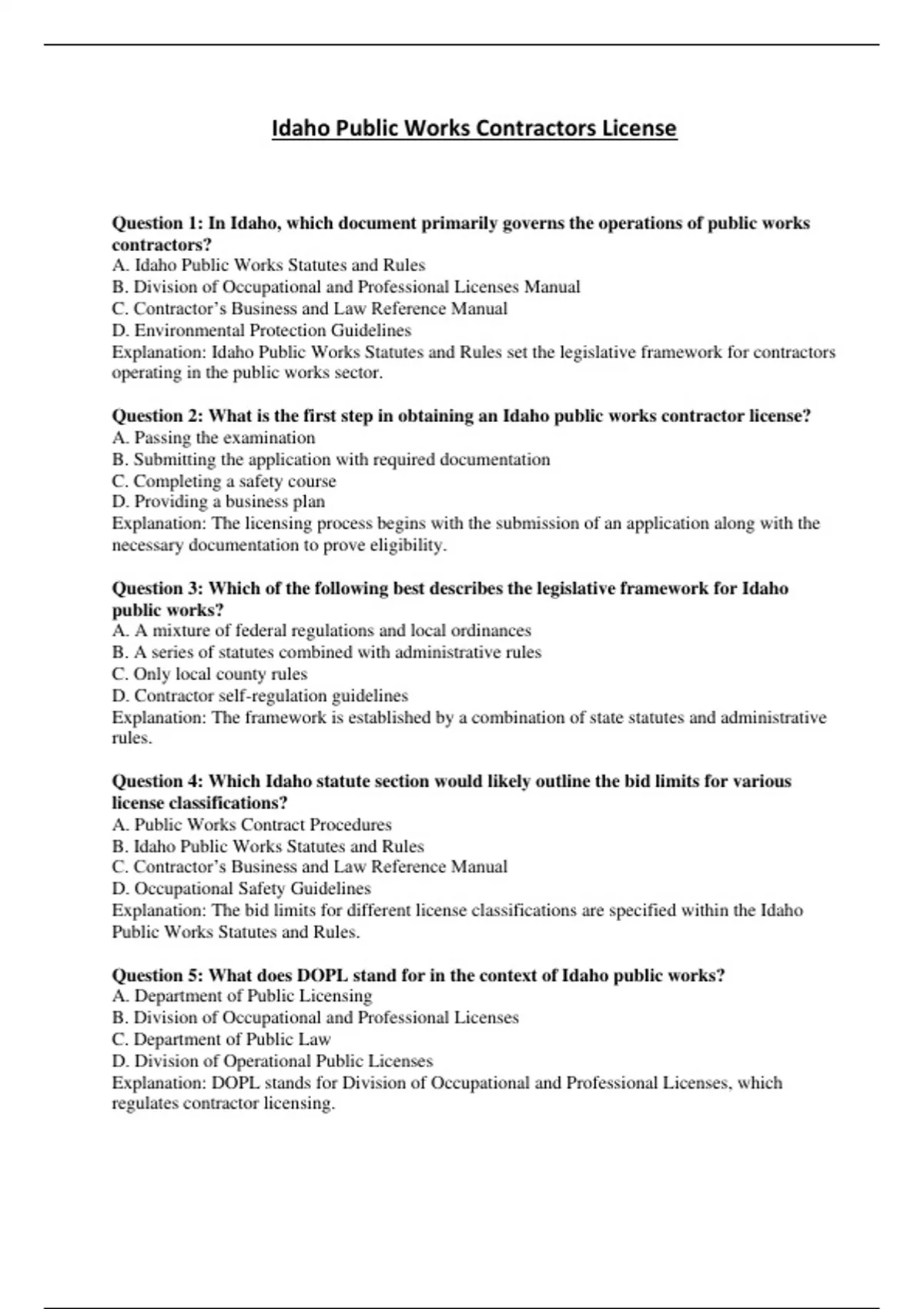 Explanation: Idaho Public Works Statutes and Rules set the legislative framework for contractors