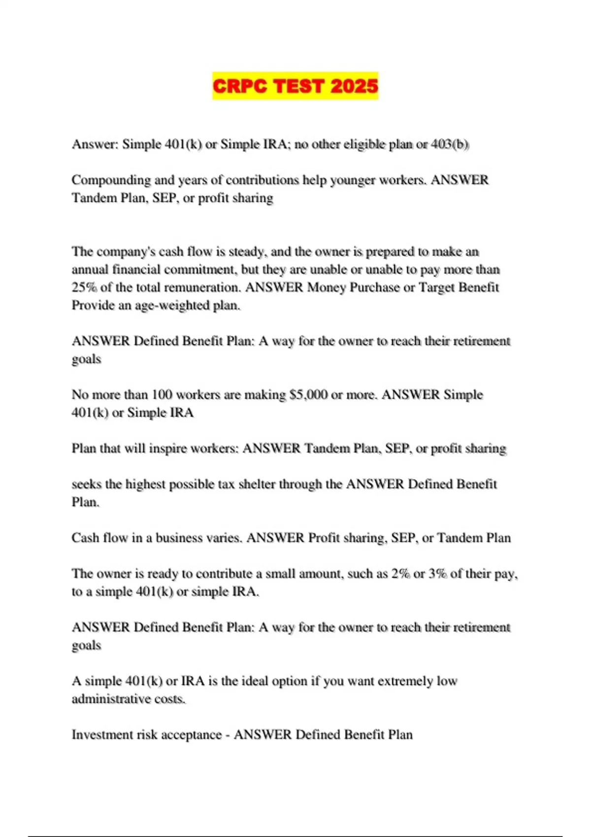 ANSWER Defined Benefit Plan: A way for the owner to reach their retirement