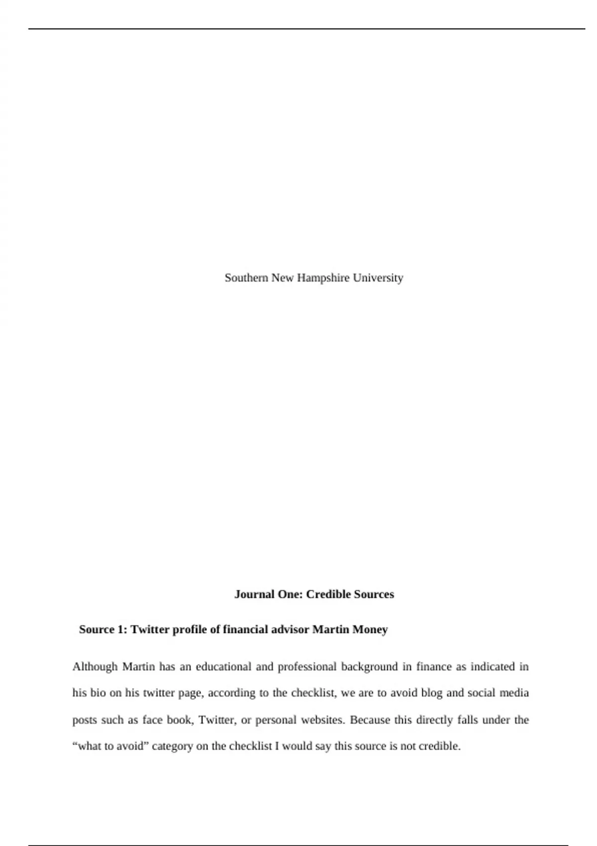 Southern New Hampshire University Journal One: Credible Sources Source 1: Twitter profile of financial advisor Martin Money Although Martin has an educational and professional background in finance as indicated in his bio on his twitter page, according to the checklist, we are to avoid blog and social media posts such as face book, Twitter, or personal websites. Because this directly falls under the œwhat to avoid category on the checklist I would say this source is not credible. Source 2: Blog website by Mary Green Thumb showing several posts about community gardening This source also falls under the œwhat to avoid category on the checklist. Although this blog gives a few great ideas on recipes and fun activities, it is from a blog and is also very opinionated. Since this source is from a blog it is not credible. Source 3: Study from the journal Annals of Agrarian Science. Th