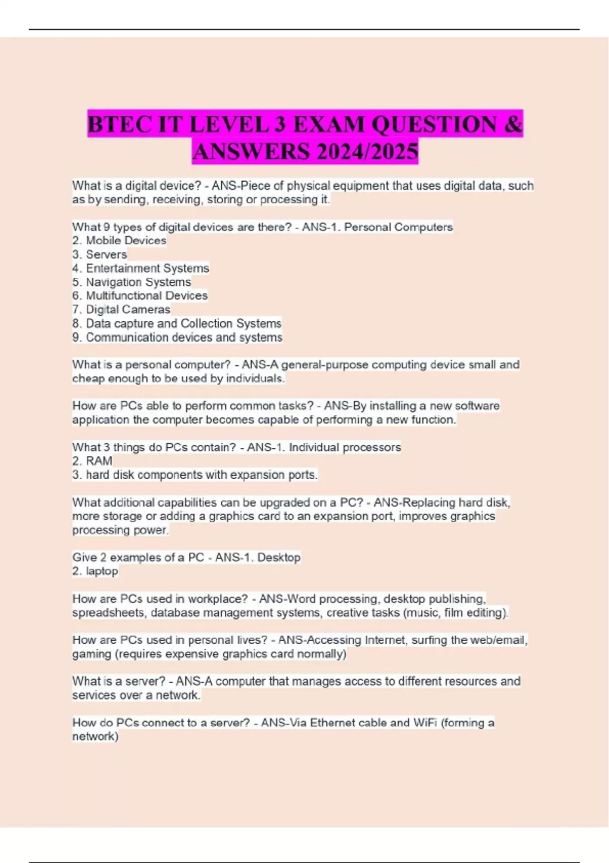 BTEC IT LEVEL 3 EXAM QUESTION & ANSWERS 2024/2025 BTEC IT LEVEL 3 EXAM QUESTION & ANSWERS 2024/2025 What is a digital device? - ANS-Piece of physical equipment that uses digital data, such as by sending, receiving, storing or processing it. What 9 types of digital devices are there? - ANS-1. Personal Computers 2. Mobile Devices 3. Servers 4. Entertainment Systems 5. Navigation Systems 6. Multifunctional Devices 7. Digital Cameras 8. Data capture and Collection Systems 9. Communication devices and systems What is a personal computer? - ANS-A general-purpose computing device small and cheap enough to be used by individuals. How are PCs able to perform common tasks? - ANS-By installing a new software application the computer becomes capable of performing a new function. What 3 things do PCs contain? - ANS-1. Individual processors 2. RAM 3. hard disk components with expansion ports. What additional capabilities can be upgraded on a PC? - ANS-Replacing hard disk, more storage or adding a graphics card to an expansion port, improves graphics processing power. Give 2 examples of a PC - ANS-1. Desktop 2. laptop How are PCs used in workplace? - ANS-Word processing, desktop publishing, spreadsheets, database management systems, creative tasks (music, film editing). How are PCs used in personal lives? - ANS-Accessing Internet, surfing the web/email, gaming (requires expensive graphics card normally) What is a server? - ANS-A computer that manages access to different resources and services over a network. How do PCs connect to a server? - ANS-Via Ethernet cable and WiFi (forming a network) What is the difference between servers and PCs? - ANS-Contain larger storage capacity, higher processing power and larger amount of memory. Give 4 examples of servers? - ANS-1. Mail servers 2. web servers 3. print servers 4. file servers How do web servers work? - ANS--Web server stores the web page and associated files. -Client computer makes request for a web page to server (by entering URL). -Web server locates correct files and sends back to client. Why are web servers used? - ANS-To manage access to web pages. Why are mail servers used? - ANS-To manage access to email How do mail servers work? - ANS--When you write an email/press send on PC, goes to outgoing mail server. -This mail server then sends across a network to recipient's mail server and stores in their mailbox. -When recipient logs into their email client the mail server will forward email to their computer. Why are file servers used? - ANS-To store your files such as word processors and spreadsheets so they are accessible from any computer on the network. Why are print servers used? - ANS-To share access to a printer. How do print servers work? - ANS-By using a print server, you can send your files to print from any computer on the network. What is a mobile device? - ANS-A computing device that is designed to be portable as it is compact, light-weight and capable of running for extended periods on battery power. What key feature helps make mobile devices more compact and reduce power consumption? - ANS-System-on-a-Chip What is System-on-a-Chip? - ANS-The core components of the computer are integrated onto a single chip. (CPU, GPU and RAM) What is a disadvantage of System-on-a-Chip? - ANS-It is hard to upgrade a mobile device as all the components are integrated on the chip. What are 2 examples? - ANS-1. Tablets 2. smartphones What are uses for mobile device? - ANS-Accessing internet on the go, playing games, calendars, email access. What is a disadvantage of mobile devices? - ANS--They all use touchscreen so are bad for word processing tasks. -Also have limited processing capabilities so are bad for graphic games/film editing. What is an entertainment system? - ANS-Computing devices that are designed to entertain (watching tv, listening to music, playing video games) Advantages of entertainment systems? - ANS--Good hard disk storage for storing tv/films, music and games. -Built in internet connectivity capabilities (WiFi). -Access to streaming and online gaming services. 3 examples of entertainment systems - ANS-1. Digital media players 2. mp3 players 3. video game consoles What is the use of digital media players? - ANS-Allows us to stream digital media (films, tv) over a network. What is the use of portable media players? - ANS-Portable media players download media to device and are played off hard disk. What is the use of MP3 players? - ANS-Used to access and listen to music on a small portable device. What are MP4 players? - ANS-They are the same as MP3 players but can watch videos as well. What is the use of video game consoles? - ANS-Allow you to play video games. Can even use internet to play games online with people globally. What are navigation systems? - ANS-A digital device that uses GPS (Global Positioning System) to provide a real-time map of our current location, allowing us to plan a route to be directed to a chosen destination. What features do some Navigation systems have? - ANS--Identifying traffic, roadworks and accidents that may delay your journey. -Provides an accurate destination time. What is an example of navigation systems? - ANS-In car satnav What is the use of in car satnav? - ANS-Used instead of traditional maps to help direct you along the fastest route. Can be integrated directly into car's dashboard but is often standalone. (e.g. TomTom) Why has standalone satnavs been replaced? - ANS-As navigation systems are now being used in mobile devices for driving, walking, cycling. What is a multifunctional device? - ANS-A device that is capable of performing more than one specific function. (Also known as MFD and multifunctional peripherals) What are examples of a multifunctional device? - ANS-Multifunctional printers, touchscreens, force-feedback game controllers. What is a multifunctional printer? - ANS-A device that usually combines printing, scanning and faxing functions all into a single device. Where are multifunctiona