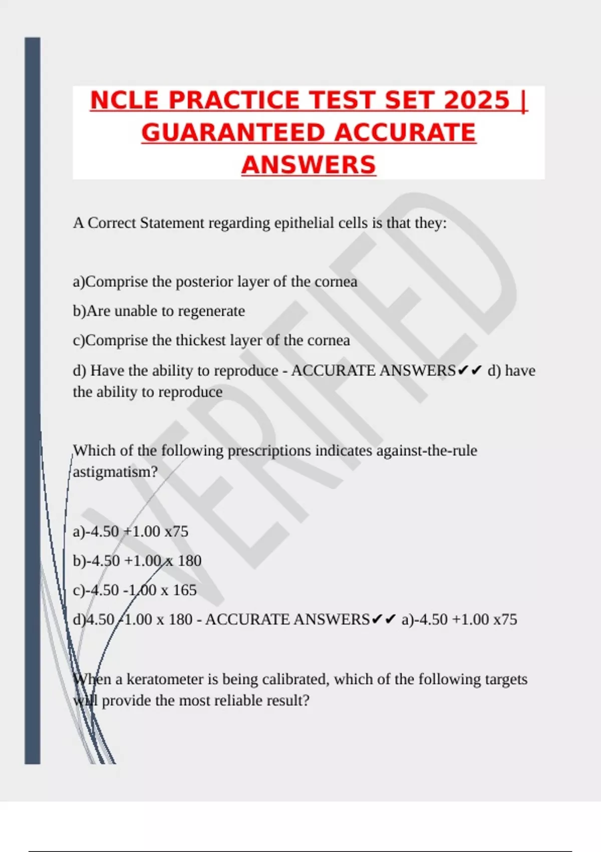 d)4.50 -1.00 x 180 - ACCURATE ANSWERS✔✔ a)-4.50 +1.00 x75