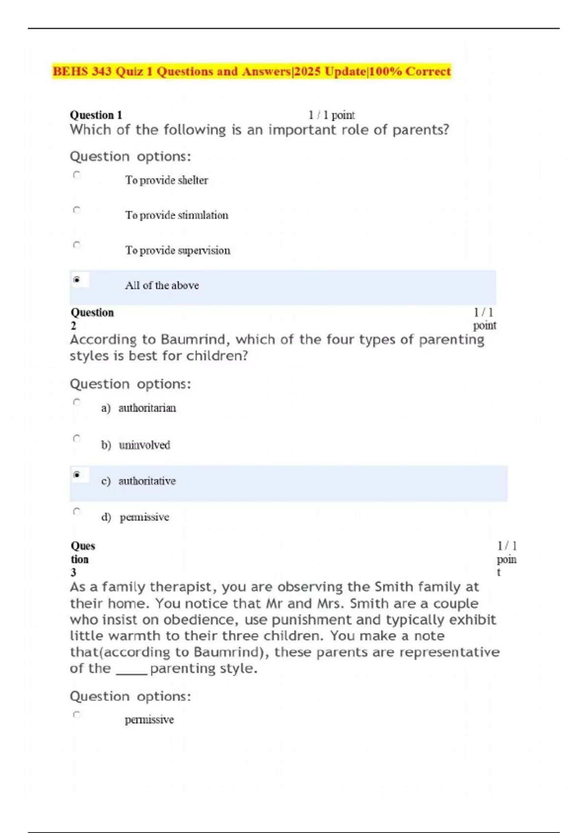 BEHS 343 Quiz 1 Questions and Answers|2025 Update|100% Correct. BEHS 343 Quiz 1