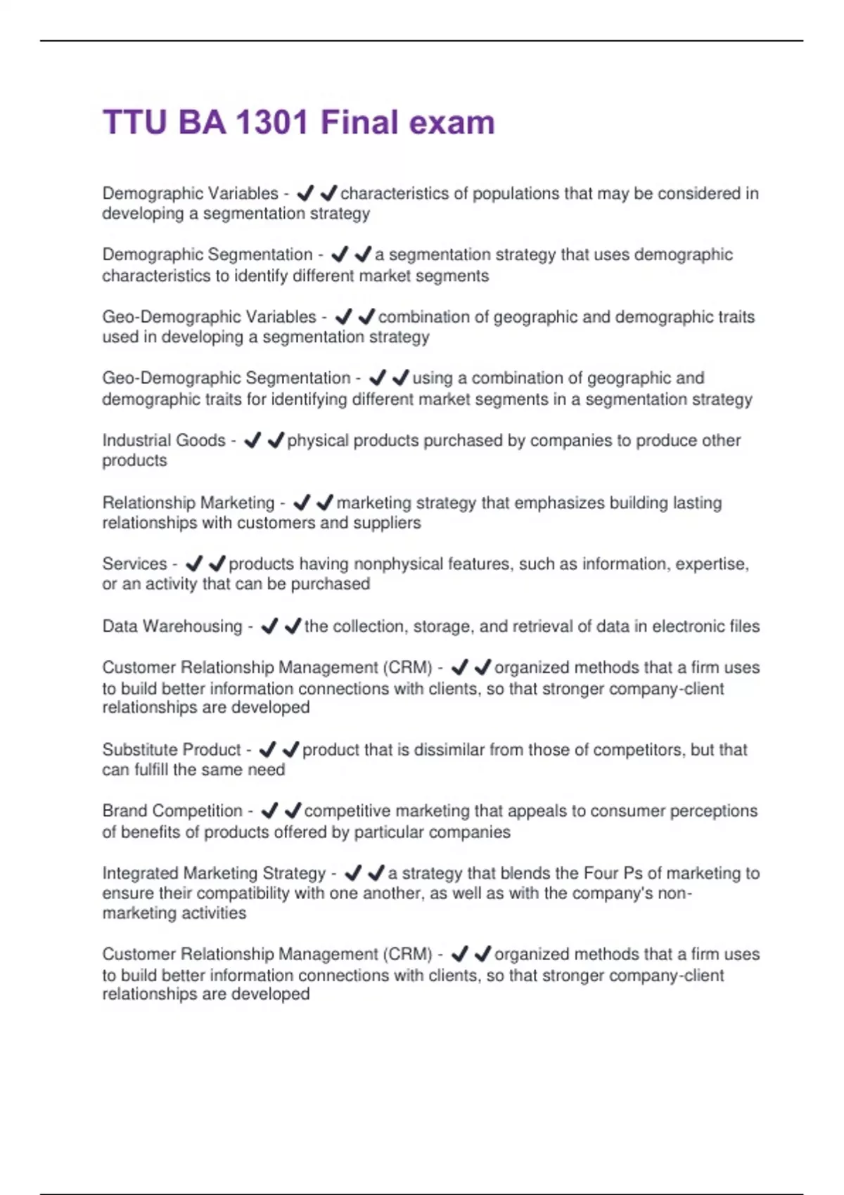 Demographic Variables - ️️characteristics of populations that may be considered in developing a segmentation strategy Demographic Segmentation - ️️a segmentation strategy that uses demographic characteristics to identify different market segments Geo-Demographic Variables - ️️combination of geographic and demographic traits used in developing a segmentation strategy Geo-Demographic Segmentation - ️️using a combination of geographic and demographic traits for identifying different market segments in a segmentation strategy Industrial Goods - ️️physical products purchased by companies to produce other products Relationship Marketing - ️️marketing strategy that emphasizes building lasting relationships with customers and suppliers