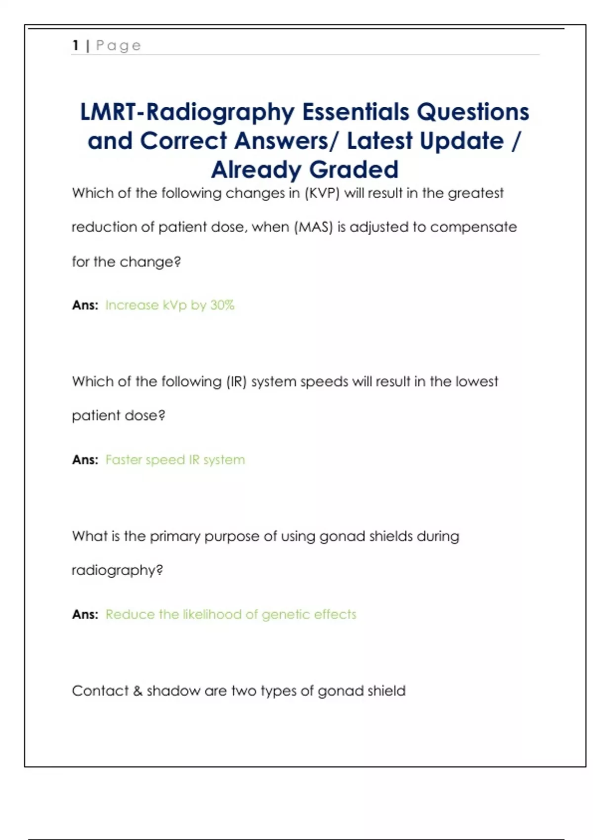 Which of the following changes in (KVP) will result in the greatest reduction of patient dose, when (MAS) is adjusted to compensate for the change? Ans: Increase kVp by 30% Which of the following (IR) system speeds will result in the lowest patient dose? Ans: Faster speed IR system What is the primary purpose of using gonad shields during radiography? Ans: Reduce the likelihood of genetic effects Contact & shadow are two types of gonad shield 2 | Page Ans: TRUE When should gonad shields be used? Ans: When the gonads are within 5cm of the radiation field The greatest cause of unnecessary radiation to patients that can be controlled by the limited operator are: Ans: repeat exposures