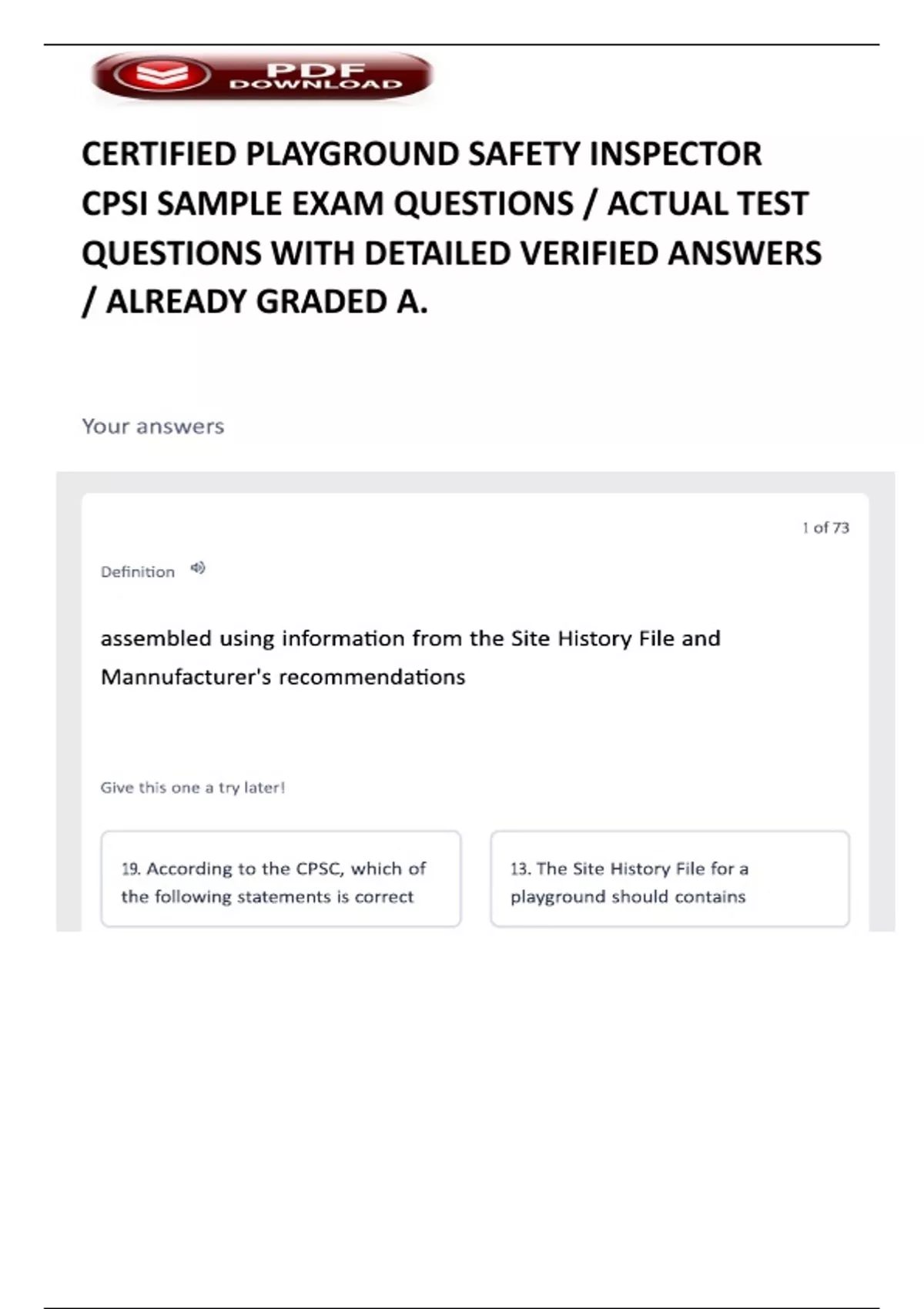 CERTIFIED PLAYGROUND SAFETY INSPECTOR CPSI SAMPLE EXAM QUESTIONS / ACTUAL TEST QUESTIONS WITH DETAILED VERIFIED ANSWERS / ALREADY GRADED A.