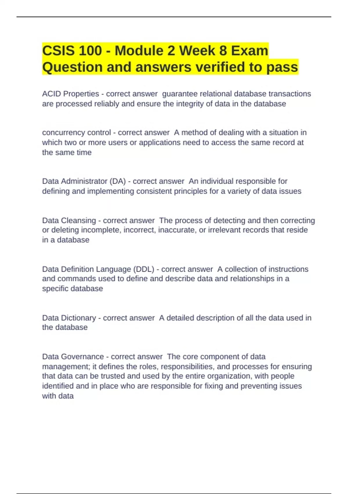 Data Definition Language (DDL) - correct answer A collection of instructions