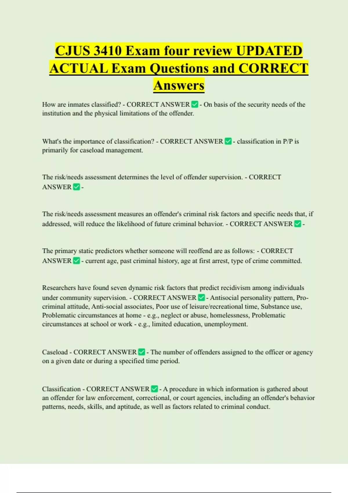 CJUS 3410 Exam four review UPDATED ACTUAL Exam Questions and CORRECT Answers How are inmates classified? - CORRECT ANSWER - On basis of the security needs of the institution and the physical limitations of the offender. What's the importance of classification? - CORRECT ANSWER - classification in P/P is primarily for caseload managemen