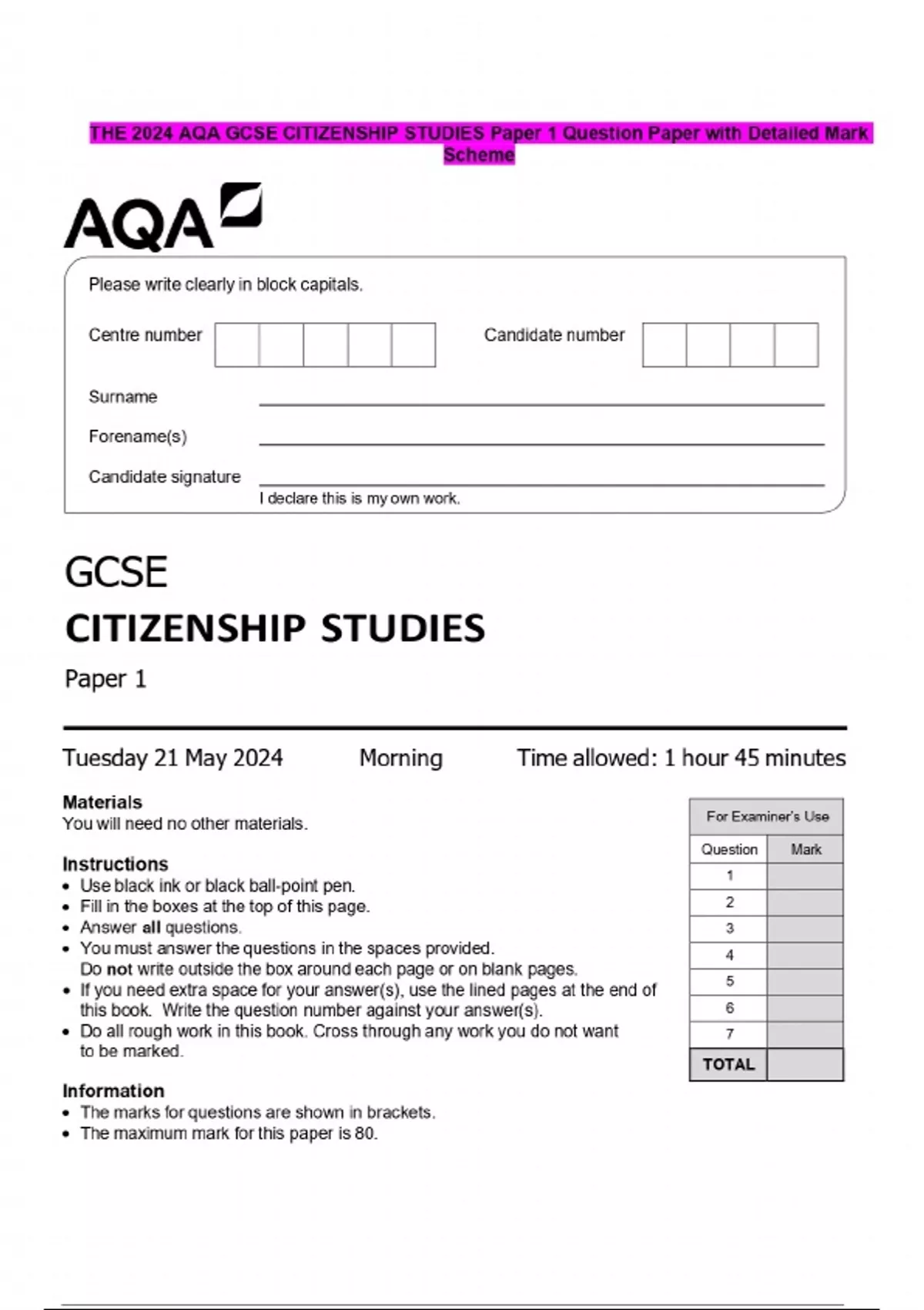 THE 2024 AQA GCSE CITIZENSHIP STUDIES Question Paper with Detailed Mark Scheme