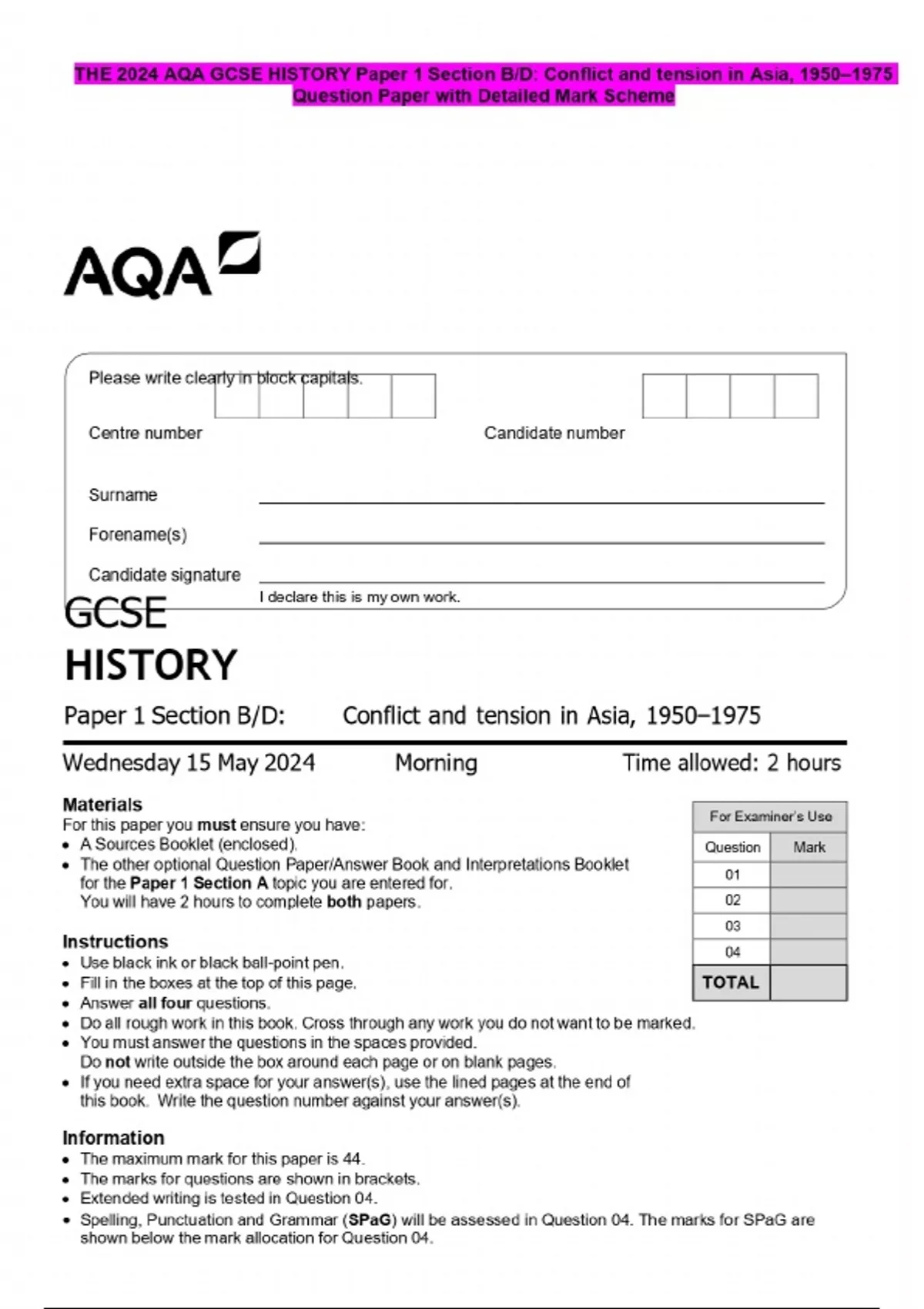 THE 2024 AQA GCSE HISTORY Paper 1 Section B/D: Conflict and tension in Asia, 1950–1975 Question Paper with Detailed Mark Scheme