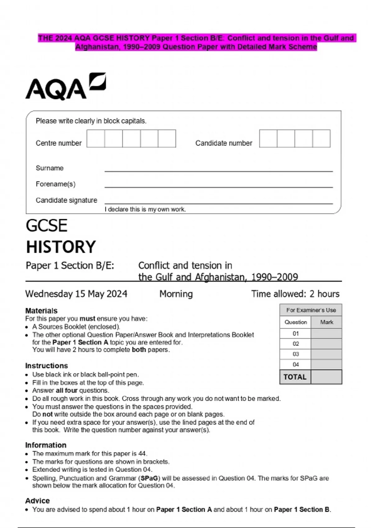 THE 2024 AQA GCSE HISTORY Paper 1 Section B/E: Conflict and tension in the Gulf and Afghanistan, 1990–2009 Question Paper with Detailed Mark Scheme