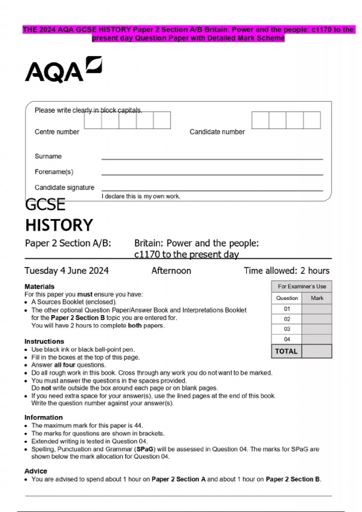 THE 2024 AQA GCSE HISTORY Paper 2 Section A/B Britain: Power and the people: c1170 to the present day Question Paper with Detailed Mark Scheme