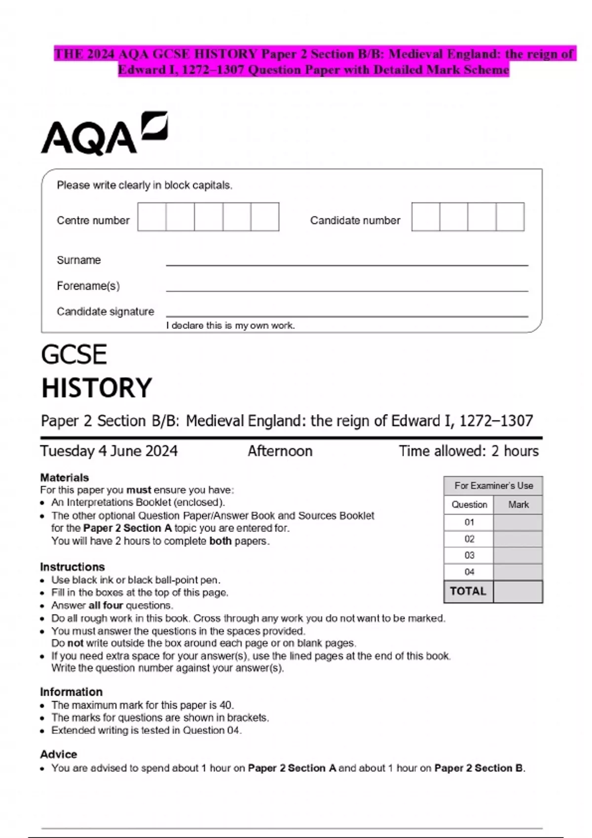 THE 2024 AQA GCSE HISTORY Paper 2 Section B/B: Medieval England: the reign of Edward I, 1272–1307 Question Paper with Detailed Mark Scheme