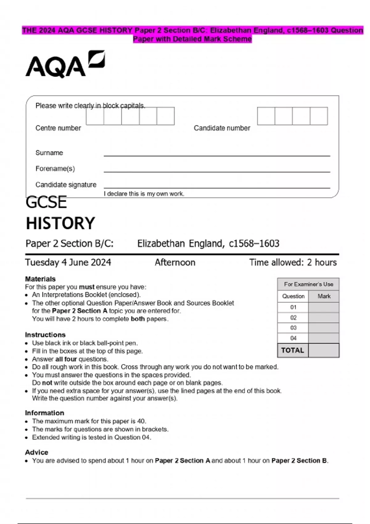 THE 2024 AQA GCSE HISTORY Paper 2 Section B/C: Elizabethan England, c1568–1603 Question Paper with Detailed Mark Scheme