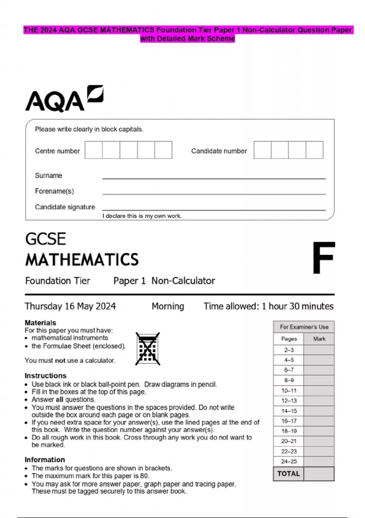 THE 2024 AQA GCSE MATHEMATICS Foundation Tier Paper 1 Non-Calculator Question Paper with Detailed Mark Scheme