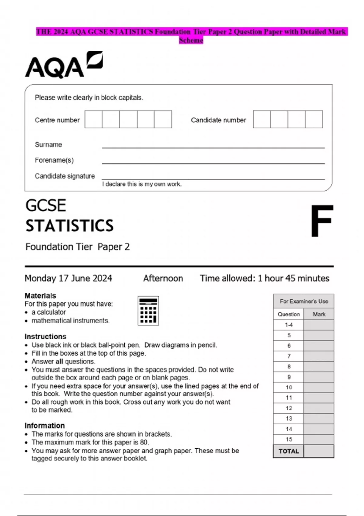 THE 2024 AQA GCSE STATISTICS Foundation Tier Paper 2 Question Paper with Detailed Mark Scheme