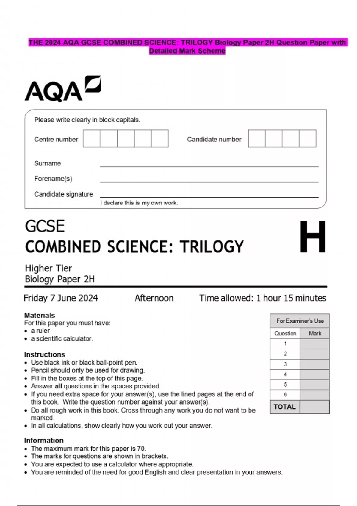 THE 2024 AQA GCSE COMBINED SCIENCE: TRILOGY Biology Paper 2H Question Paper with Detailed Mark Scheme