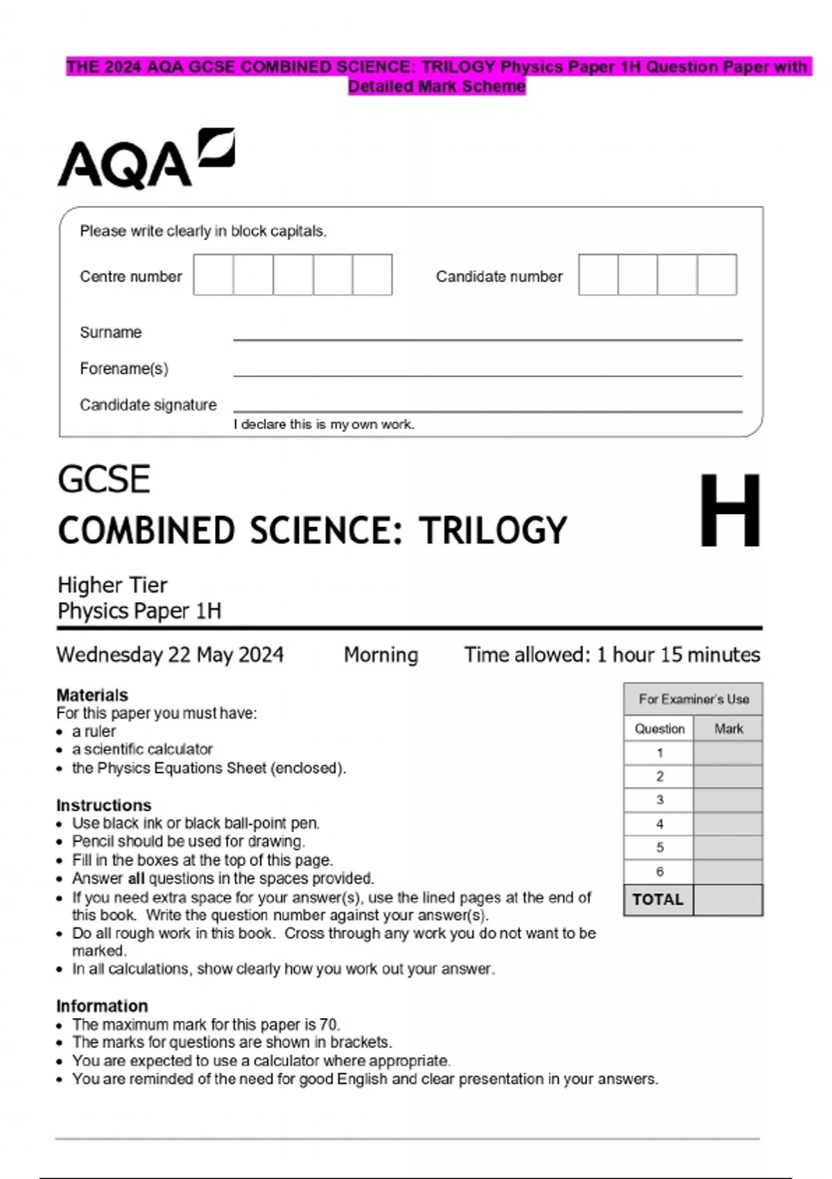 THE 2024 AQA GCSE COMBINED SCIENCE: TRILOGY Physics Paper 1H Question Paper with Detailed Mark Scheme