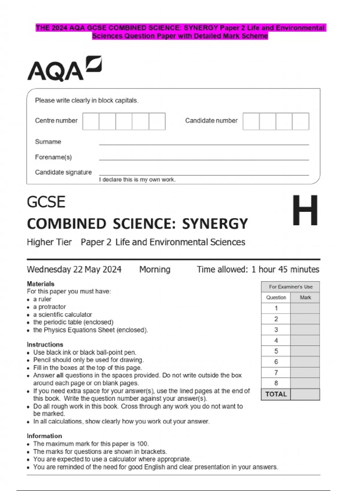 THE 2024 AQA GCSE COMBINED SCIENCE: SYNERGY Question Paper with Detailed Mark Scheme
