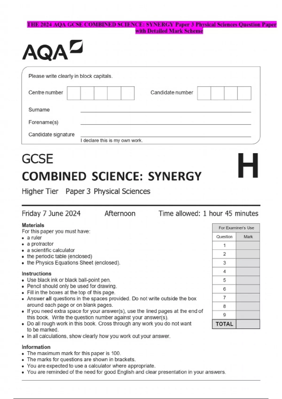 THE 2024 AQA GCSE COMBINED SCIENCE: SYNERGY Paper 3 Physical Sciences Question Paper with Detailed Mark Scheme