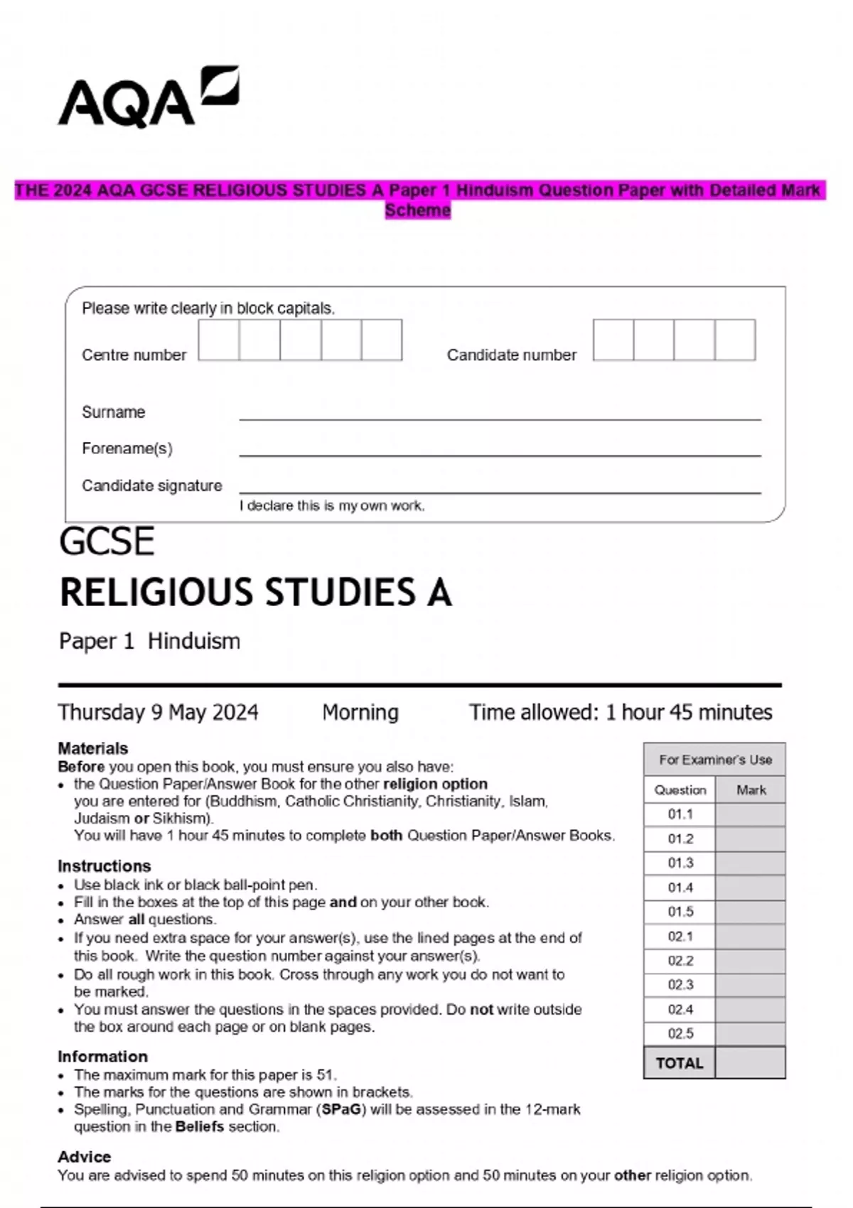 THE 2024 AQA GCSE RELIGIOUS STUDIES A Paper 1 Hinduism Question Paper with Detailed Mark Scheme
