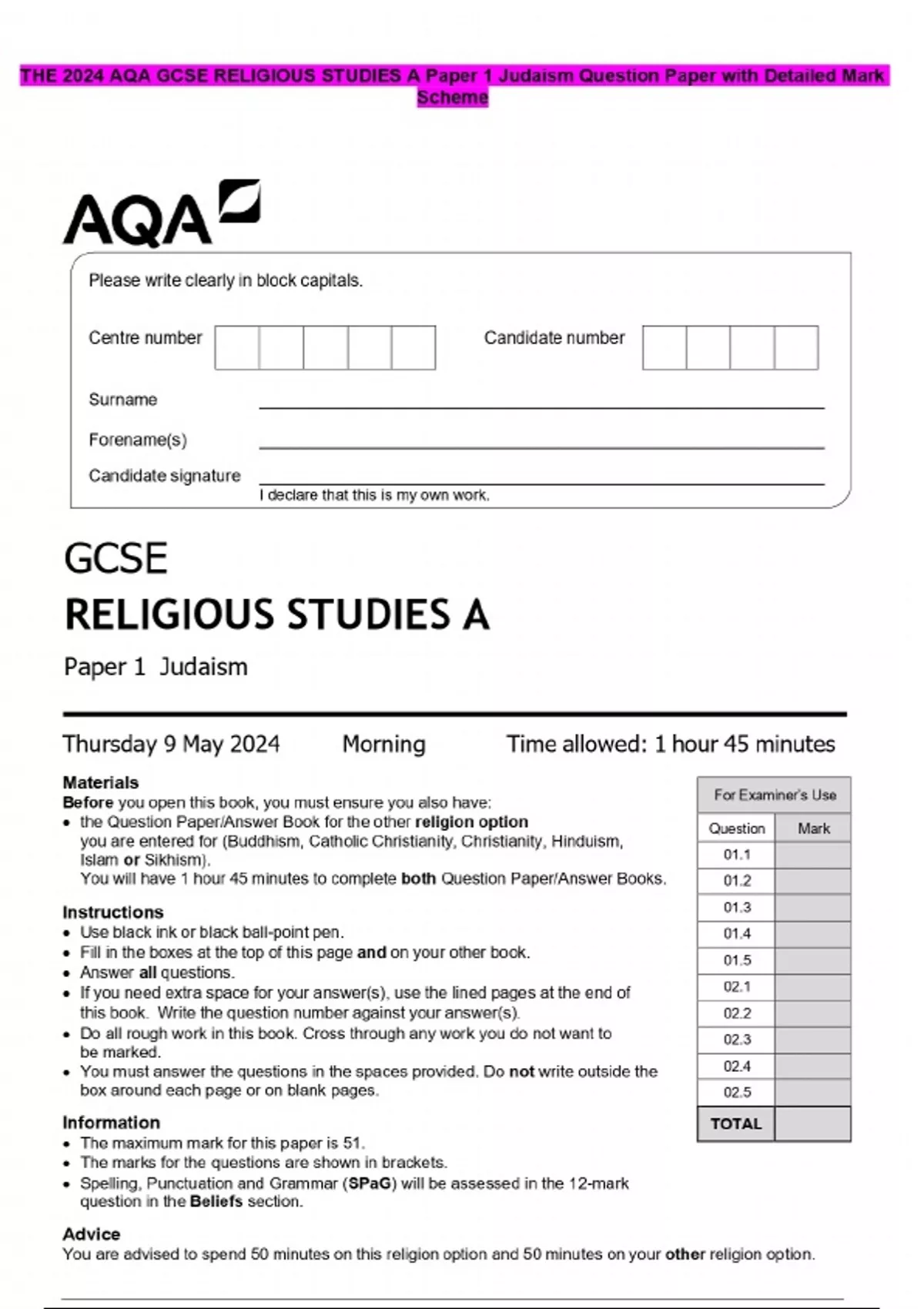 THE 2024 AQA GCSE RELIGIOUS STUDIES A Paper 1 Judaism Question Paper with Detailed Mark Scheme