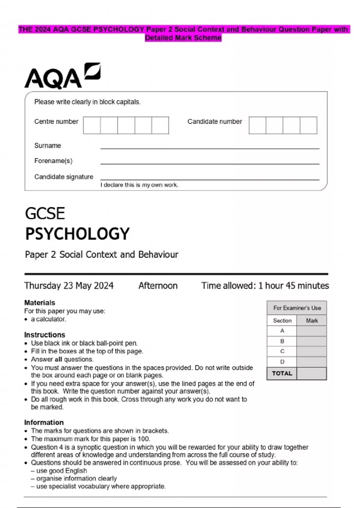 THE 2024 AQA GCSE PSYCHOLOGY Paper 2 Social Context and Behaviour Question Paper with Detailed Mark Scheme