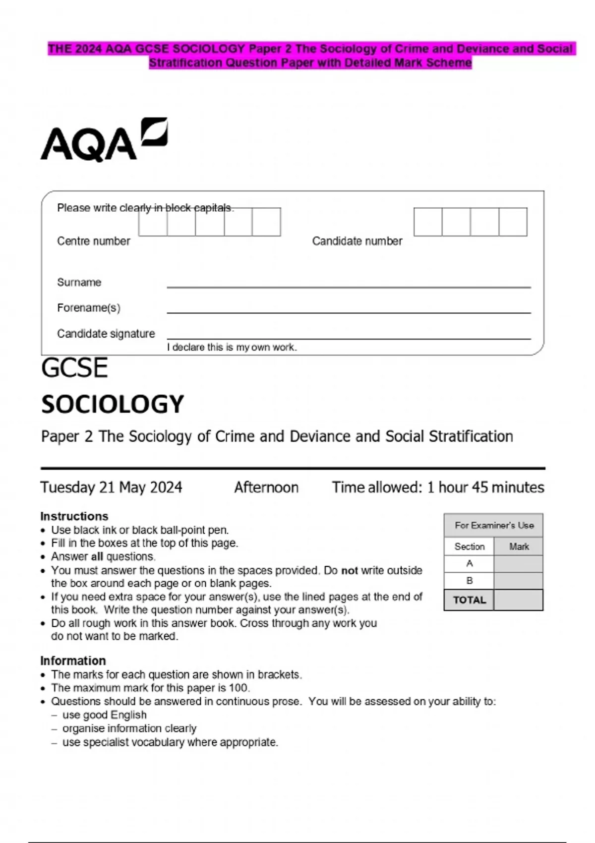 THE 2024 AQA GCSE SOCIOLOGY Paper 2 The Sociology of Crime and Deviance and Social Stratification Question Paper with Detailed Mark Scheme