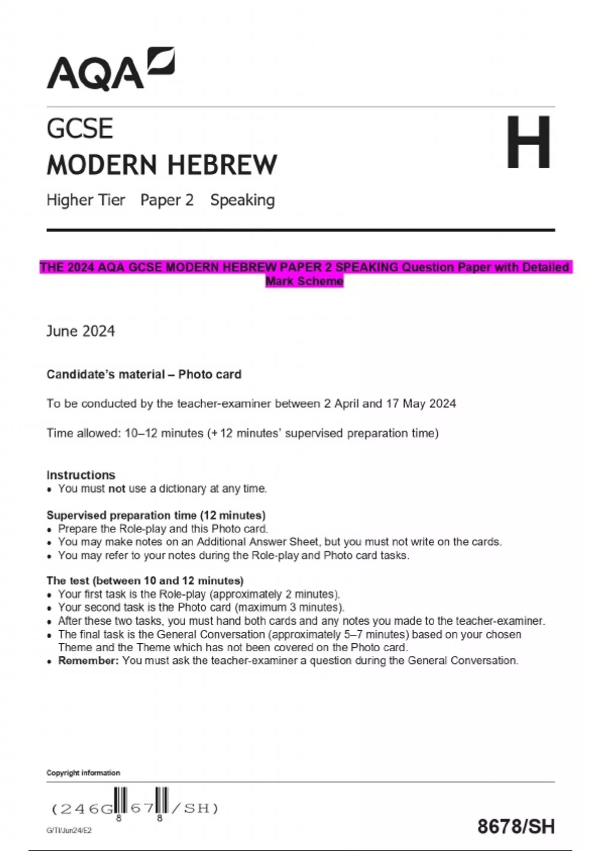THE 2024 AQA GCSE MODERN HEBREW PAPER 2 SPEAKING Question Paper with Detailed Mark Scheme