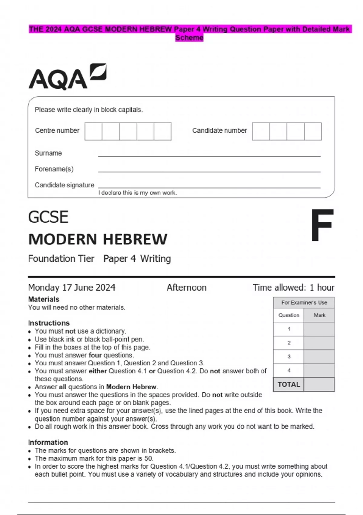 THE 2024 AQA GCSE MODERN HEBREW Paper 4 Writing Question Paper with Detailed Mark Scheme