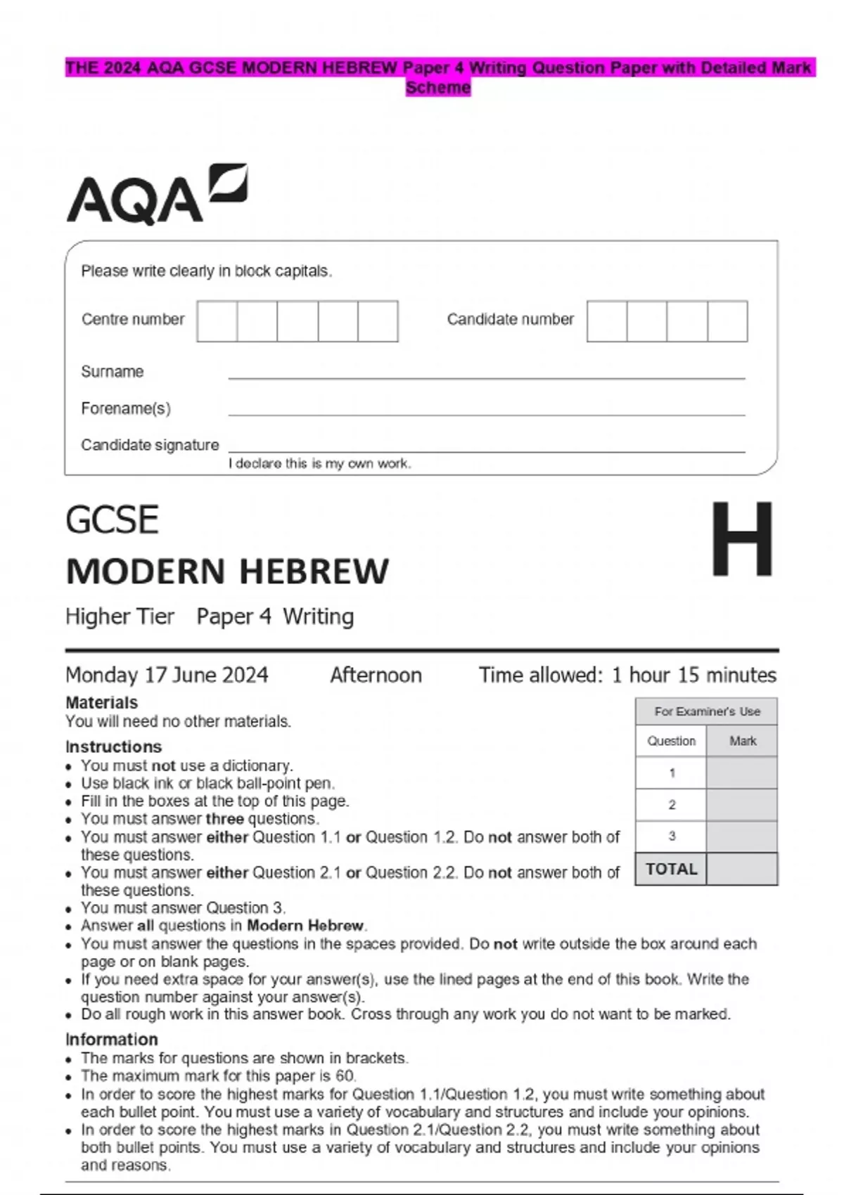 THE 2024 AQA GCSE MODERN HEBREW Paper 4 Writing Question Paper with Detailed Mark Scheme
