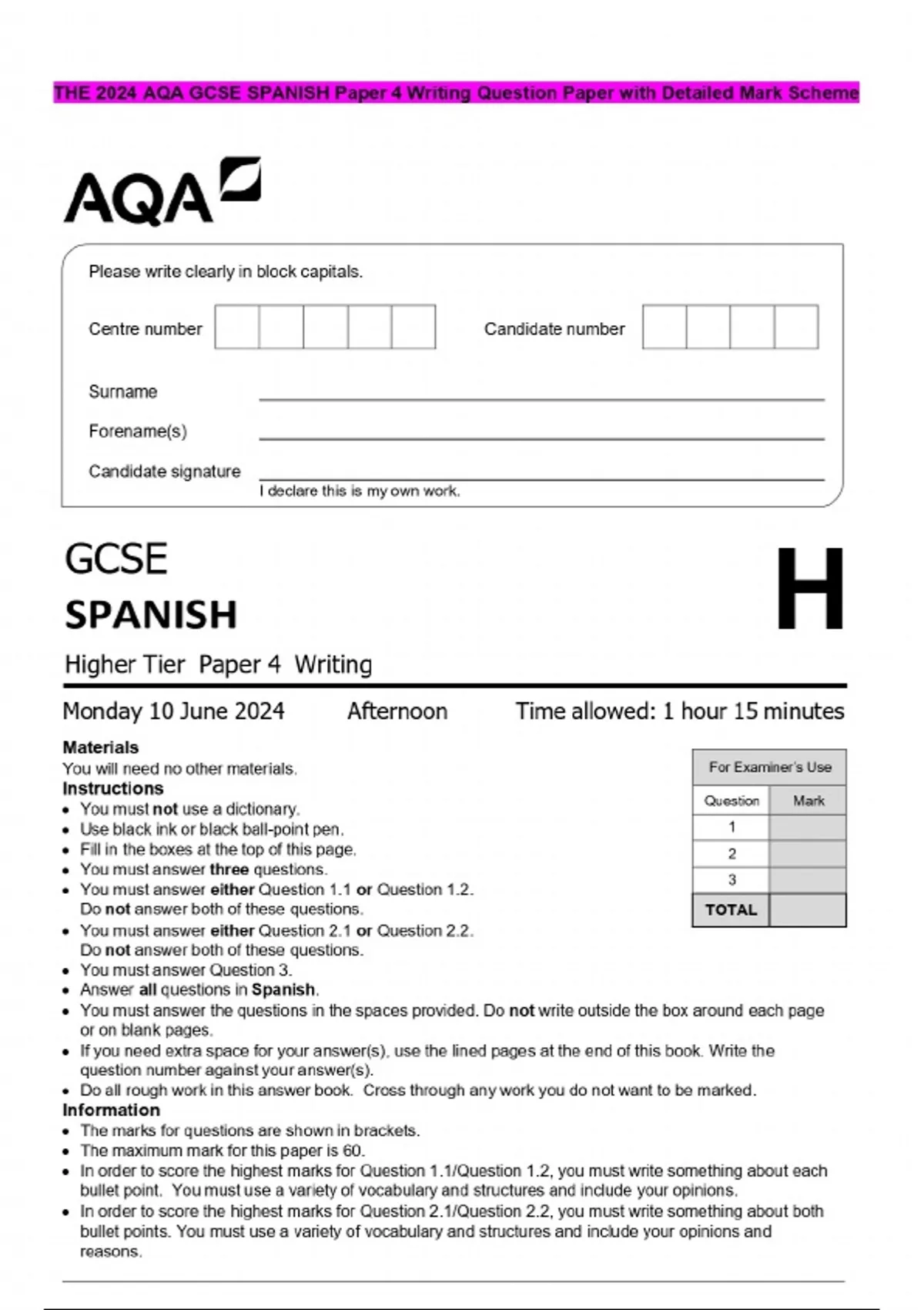 THE 2024 AQA GCSE SPANISH Paper 4 Writing Question Paper with Detailed Mark Scheme