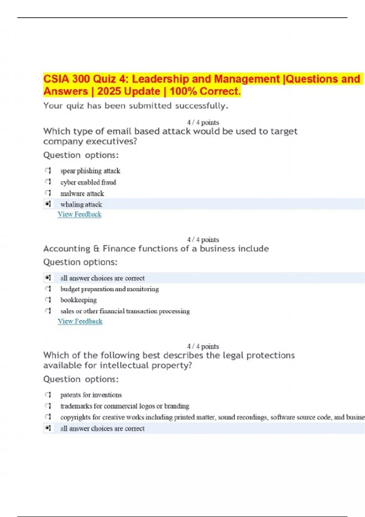 CSIA 300 Quiz 4: Leadership and Management |Questions and Answers | 2025 Update | 100% Correct.