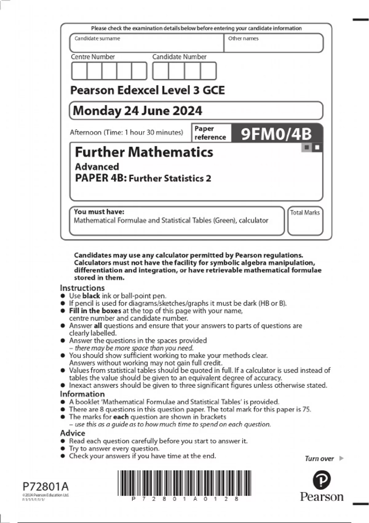 Pearson Edexcel Level 3 GCE Further Mathematics Advanced PAPER 4B: Further Statistics 2 JUNE2024 Question Paper and Mark Scheme