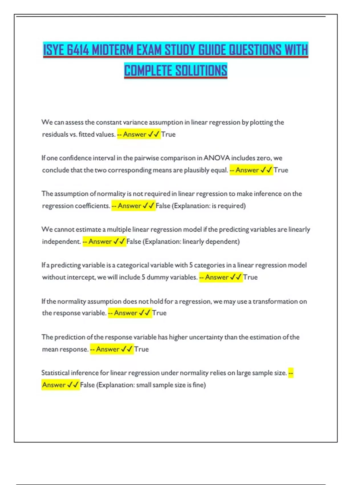 ISYE 6414 MIDTERM EXAM STUDY GUIDE QUESTIONS WITH