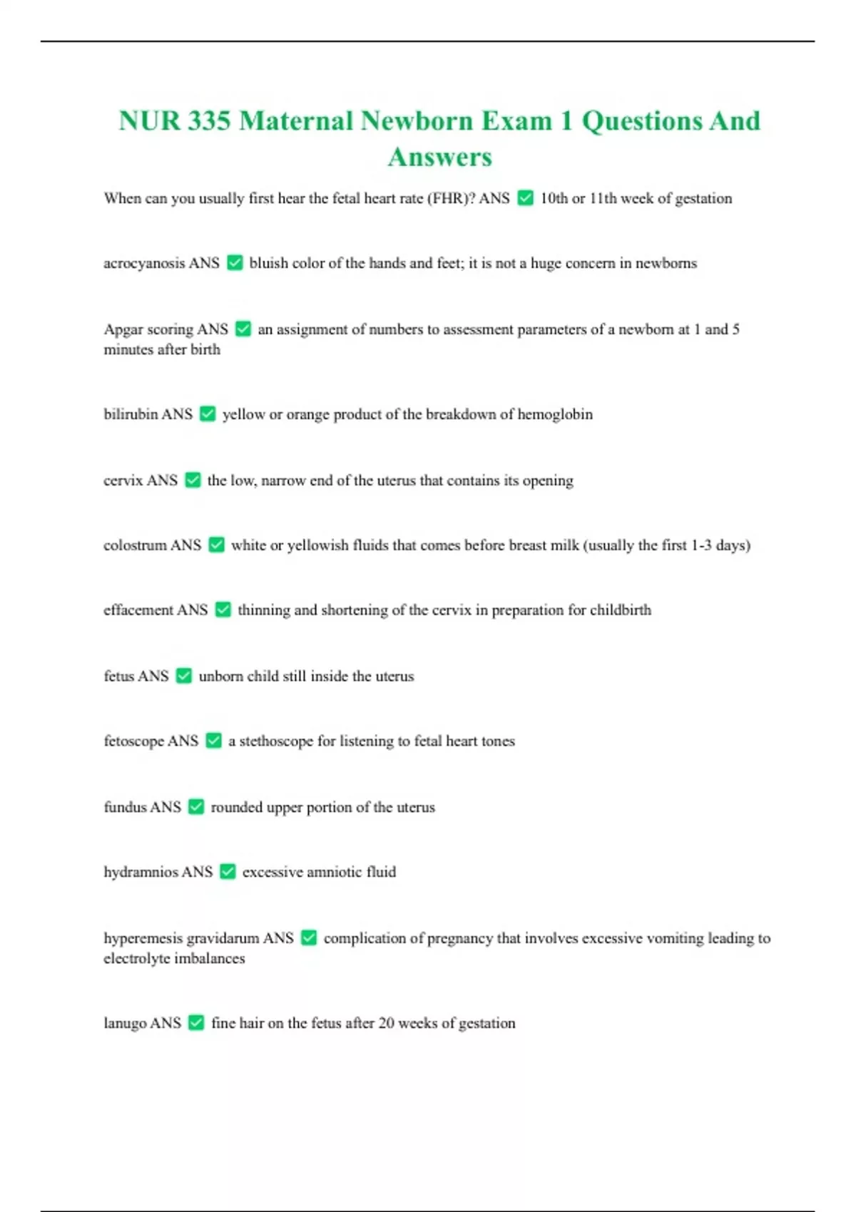 NUR 335 Maternal Newborn Exam 1 Questions And Answers