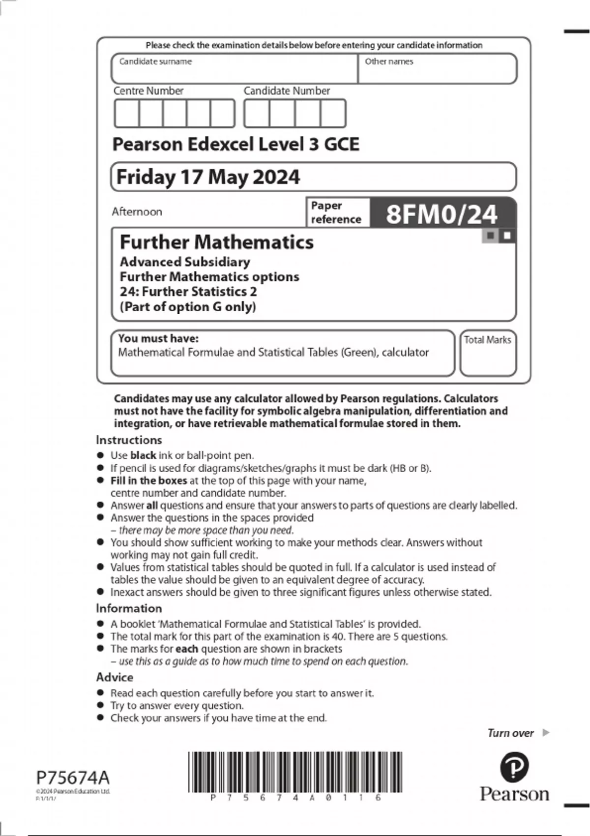 Pearson Edexcel Level 3 GCE Further Mathematics Advanced Subsidiary Further Mathematics options 24: Further Statistics 2 (Part of option G only) MAY 2024 Question Paper and Mark Scheme