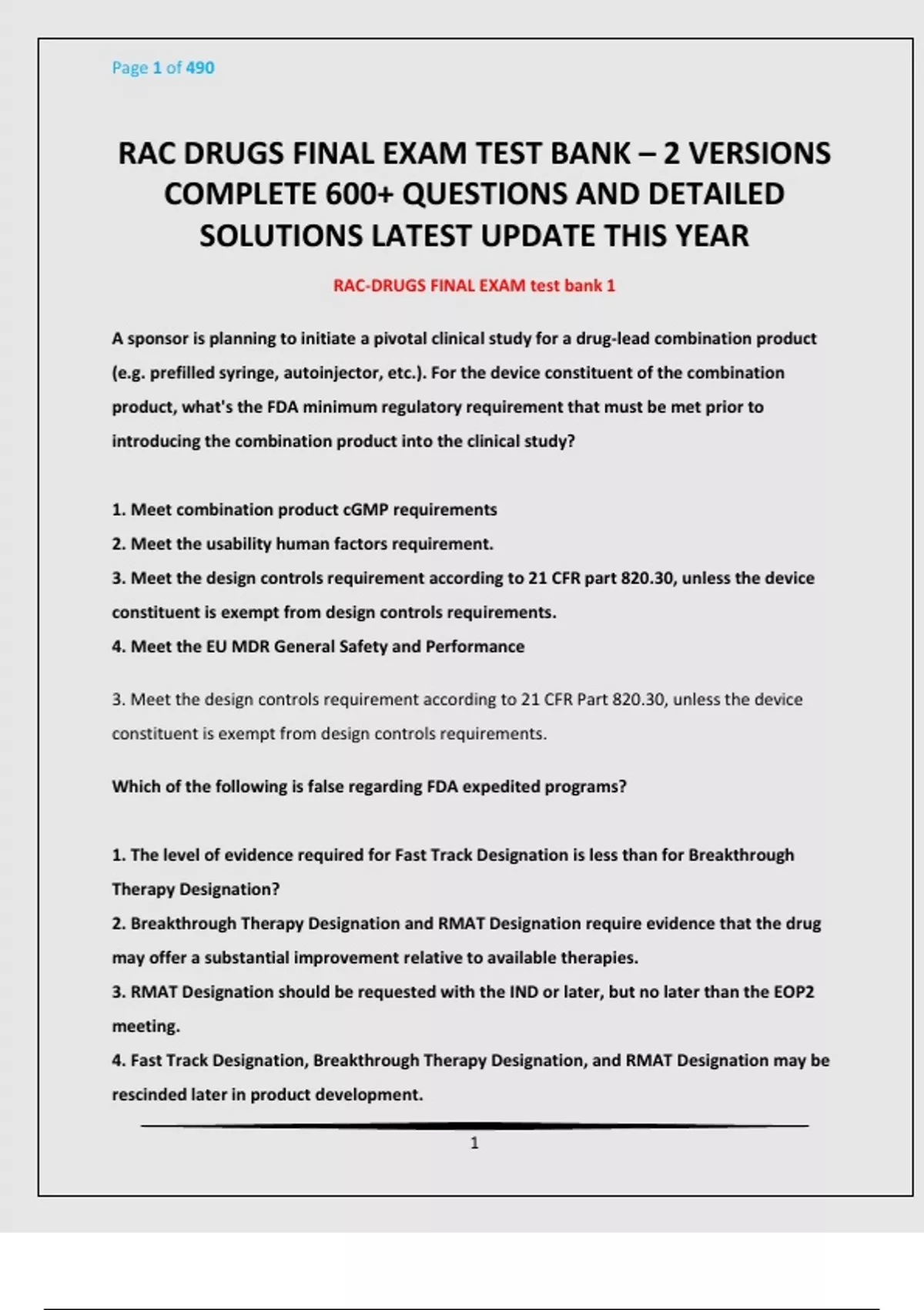 RAC DRUGS FINAL EXAM TEST BANK – 2 VERSIONS