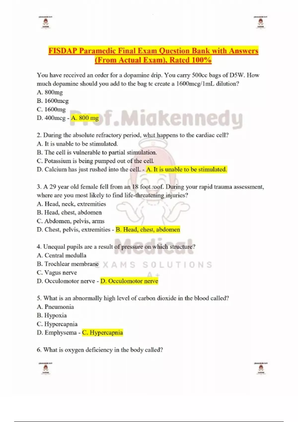 FISDAP Paramedic Final Exam Question Bank with Answers (From Actual Exam), Rated 100%-You have received an order for a dopamine drip. You carry 500cc bags of D5W. How much dopamine should you add to the bag to create a 1600mcg/1mL dilution? A. 800mg B. 1600mcg C. 1600mg D. 400mcg - A. 800 mg 2. During the absolute refractory period, what happens to the cardiac cell? A. It is unable to be stimulated. B. The cell is vulnerable to partial stimulation. C. Potassium is being pumped out of the cell. D. Calcium has just rushed into the cell. - A. It is unable to be stimulated. 3. A 29 year old female fell from an 18 foot roof. During your rapid trauma assessment, where are you most likely to find life-threatening injuries? A. Head, neck, extremities B. Head, chest, abdomen C. Abdomen, pelvis, arms D. Chest, pelvis, extremities - B. Head, chest, abdomen 4. Unequal pupils are a result of pressure on which structure? A. Central medulla B. Trochlear membrane C. Vagus nerve D. Occulomotor nerve - D. Occulomotor nerve 5. What is an abnormally high level of carbon dioxide in the blood called? A. Pneumonia B. Hypoxia C. Hypercapnia D. Emphysema - C. Hypercapnia 6. What is oxygen deficiency in the body called? A. Hypercarbia B. Hyperoxia C. Hypoxia D. Hypoxemia - C. Hypoxia 7. What is your initial priority at a trench collapse? A. Establishing medical command B. Maintaining control of the crowd C. Preventing a secondary collapse D. Protecting the patient's airway - A. Establishing medical command 8. A 23 year old male complains of neck stiffness and flu symptoms for the past few days. He also describes a high fever with a severe headache, dizziness and blurred vision. What should you suspect? A. Hemorrhagic stroke B. Migraine C. Meningitis D. Influenza - C. Meningitis 9. What causes an emphysema patient to have a pink appearance? A. Elevated PCO2 level B. Polycythemia C. Anemia D. Elevated PO2 level - B. Polycythemia 10. Which of the following is a musical, squeaking or whistling sound heard in inspiration and expiration while auscultating lung fields? A. Wheezing B. Snoring C. Stridor D. Gurgling - A. Wheezing 11. You are treating a 82 year old male in hypovolemic shock. In order to increase their blood pressure you should administer: A. 0.45% NaCl via IV B. isotonic fluids orally C. dextrose 5% in water via IO D. isotonic crystalloid via IV - D. isotonic crystalloid via IV 12. A 35 year old man is pulseless and apneic. He was found in a lake after falling through the ice. His wife says he left the house 3 hours ago. His is cold and rigid. What should you do? A. Perform chest compressions B. Begin active rewarming techniques C. Obtain IO access and administer a warm fluid bolus D. Contact the medical examiner - A. Perform chest compressions 13. What does a pulsating mass in the abdomen suggest? A. Abdominal aortic aneurysm B. Perforated ulcer C. Hernia D. Ruptured ectopic pregnancy - A. Abdominal aortic aneurysm 14. What is the safest and most effective landing pattern for a helicopter? A. At a slight angle like that of a jet B. Nose of the helicopter pointing up with a tail wind C. Straight up and down in a vertical motion D. Nose of the helicopter pointing down with a slow descent - A. At a slight angle like that of a jet