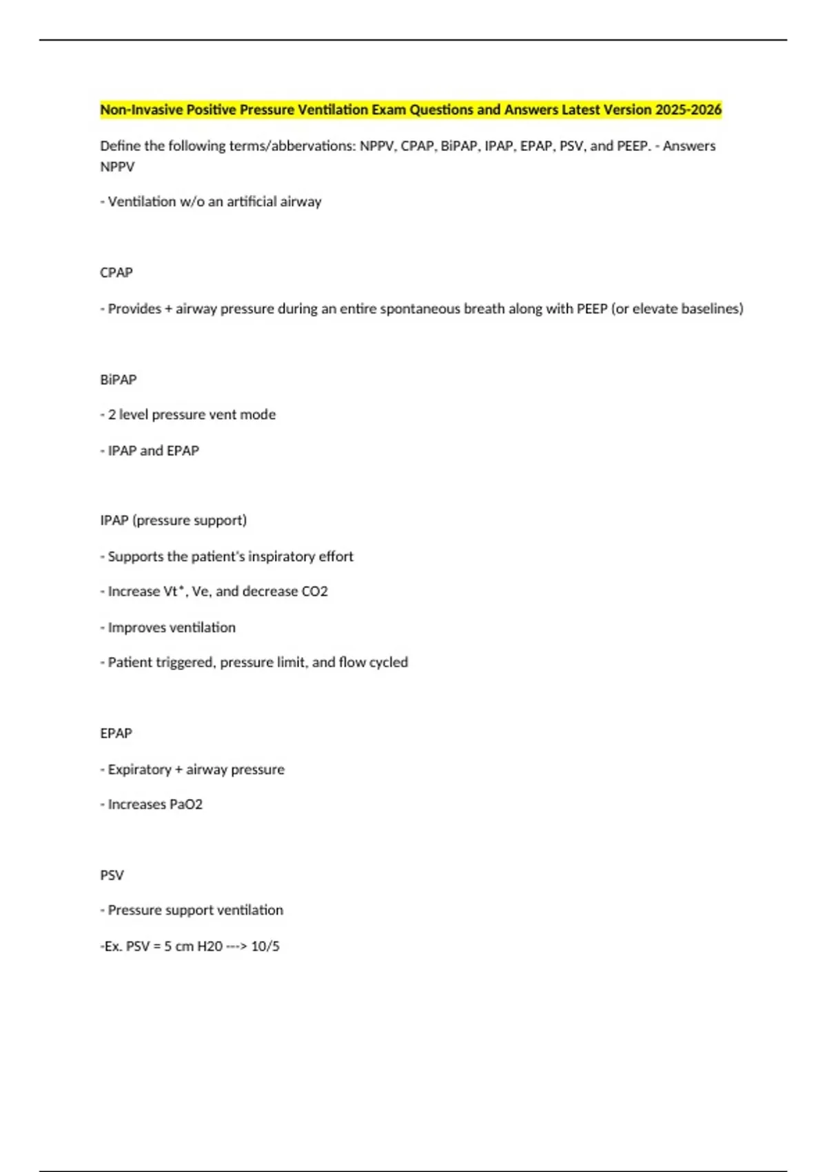 Non-Invasive Positive Pressure Ventilation Exam Questions and Answers Latest Version 2025-2026