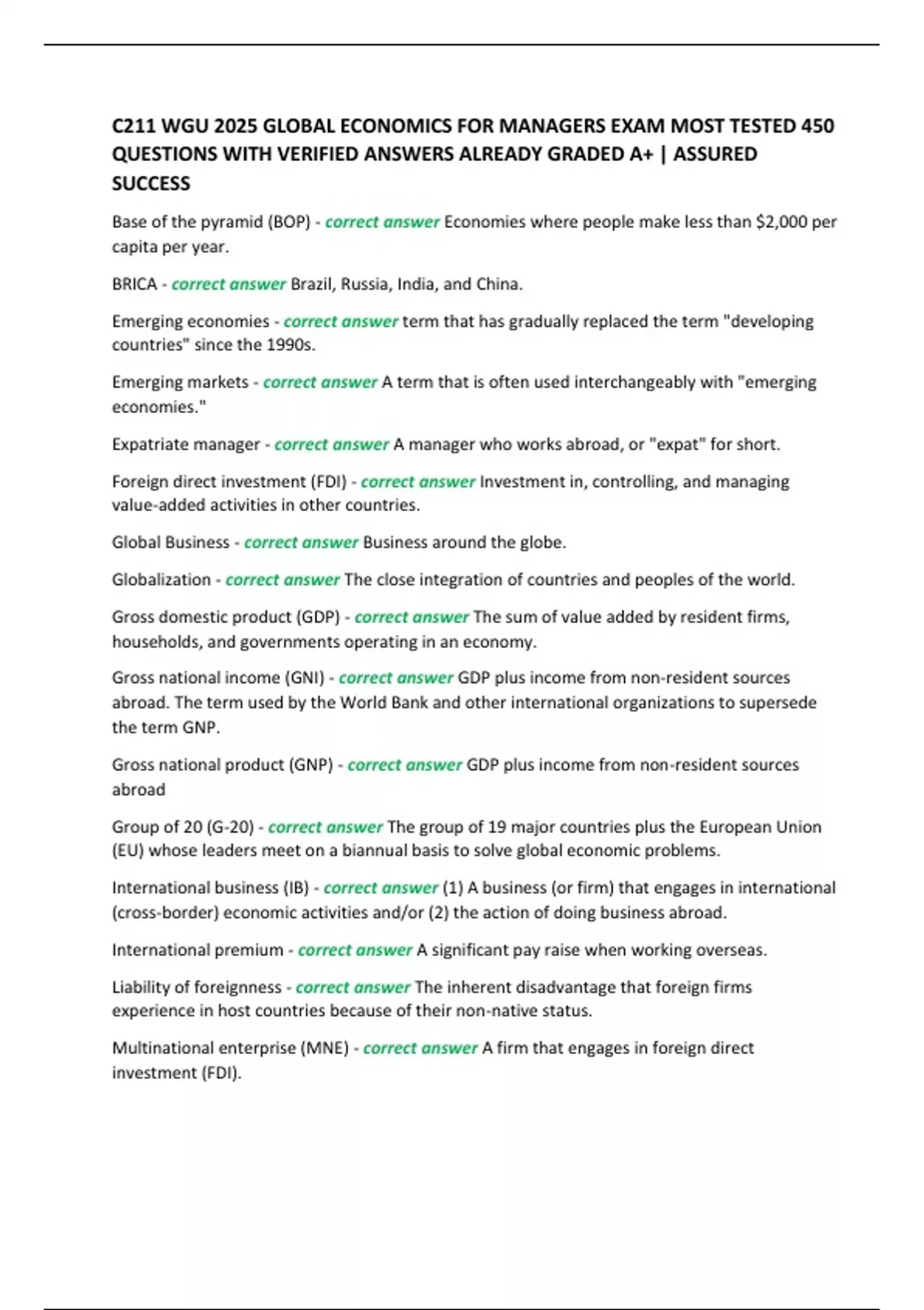 C211 WGU 2025 GLOBAL ECONOMICS FOR MANAGERS EXAM MOST TESTED 450