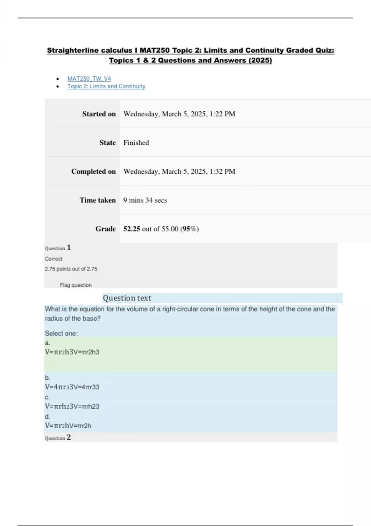 Straighterline calculus I MAT250 Topic 2: Limits and Continuity Graded Quiz: