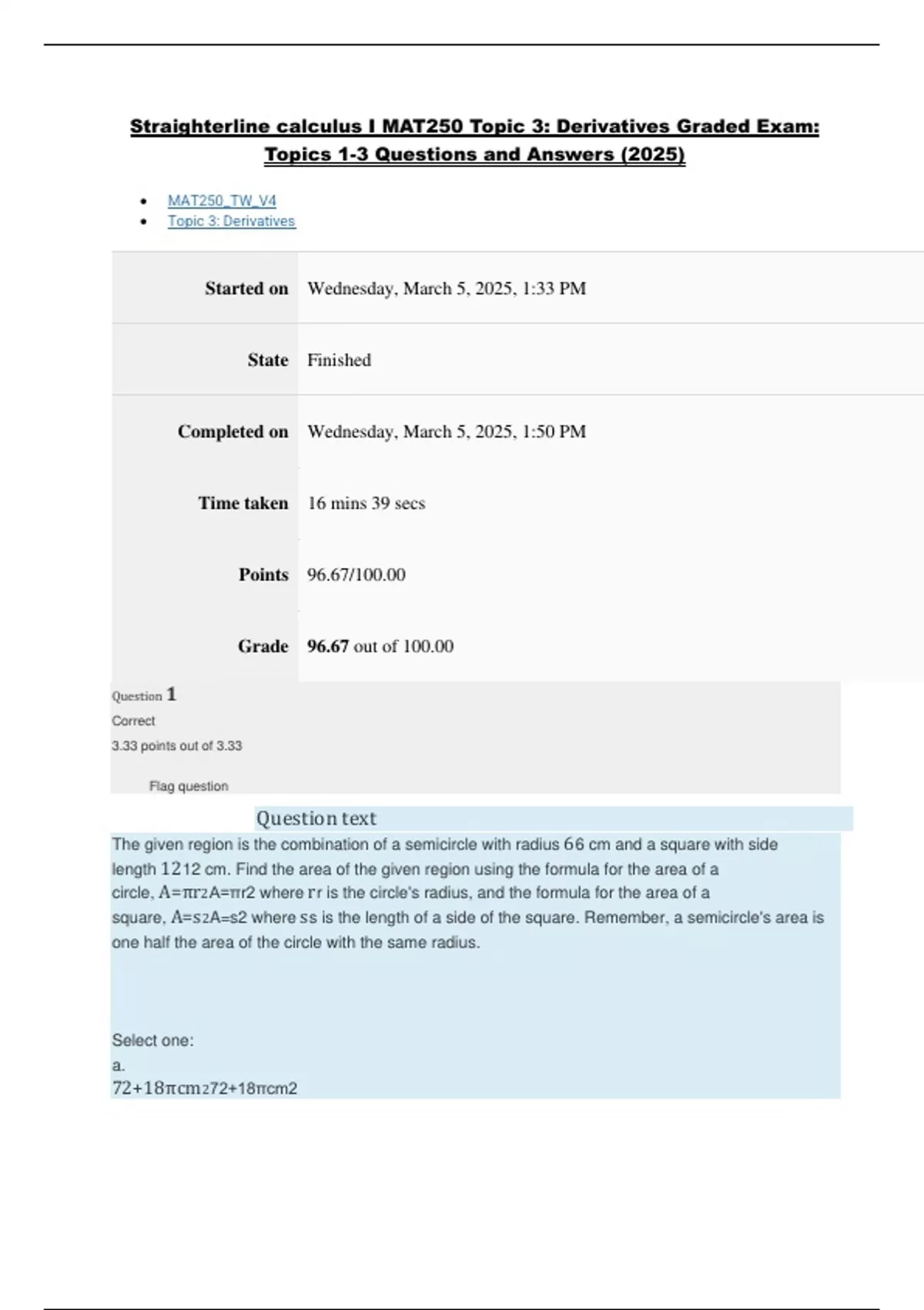 Straighterline calculus I MAT250 Topic 3: Derivatives Graded Exam:
