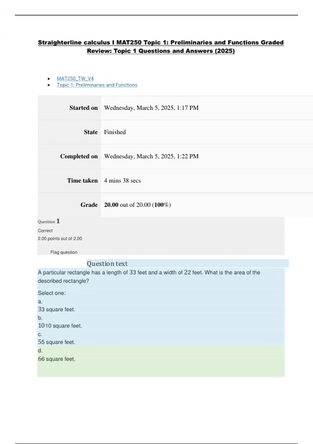 Straighterline calculus I MAT250 Topic 1: Preliminaries and Functions Graded