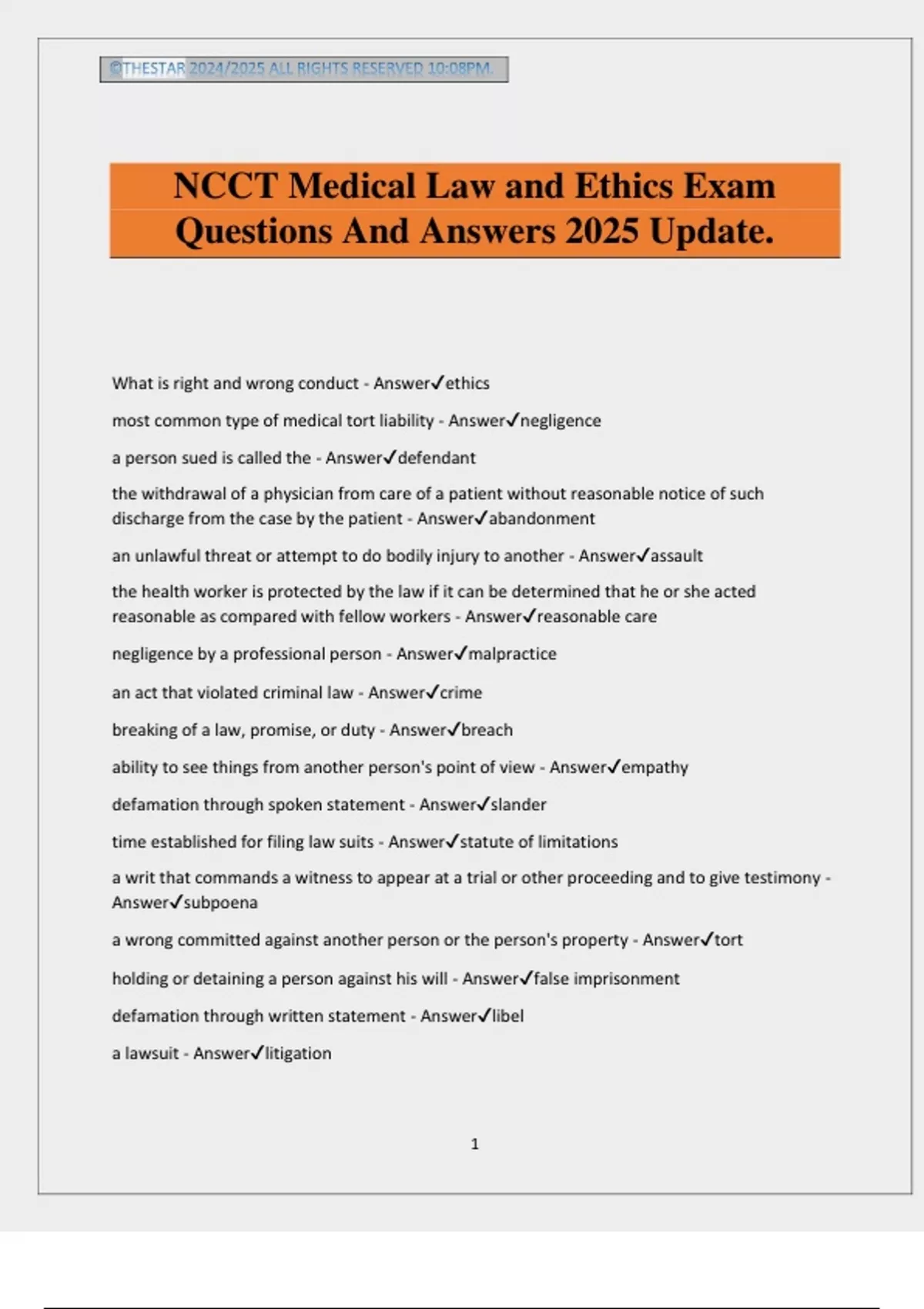 ©THESTAR 2024/2025 ALL RIGHTS RESERVED 10:08PM. 1 NCCT Medical Law and Ethics Exam Questions And Answers 2025 Update. What is right and wrong conduct - Answerethics most common type of medical tort liability - Answernegligence a person sued is called the - Answerdefendant the withdrawal of a physician from care of a patient without reasonable notice of such discharge from the case by the patient - Answerabandonment an unlawful threat or attempt to do bodily injury to another - Answerassault the health worker is protected by the law if it can be determined that he or she acted reasonable as compared with fellow workers - Answerreasonable care negligence by a professional person - Answermalpractice an act that violated criminal law - Answercrime breaking of a law, promise, or duty - Answerbreach ability to see things from another person's point of view - Answerempathy defamation through spoken statement - Answerslander time established for filing law suits - Answerstatute of limitations a writ that commands a witness to appear at a trial or other proceeding and to give testimony - Answersubpoena a wrong committed against another person or the person's property - Answertort holding or detaining a person against his will - Answerfalse imprisonment defamation through written statement - Answerlibel a lawsuit - Answerlitigat