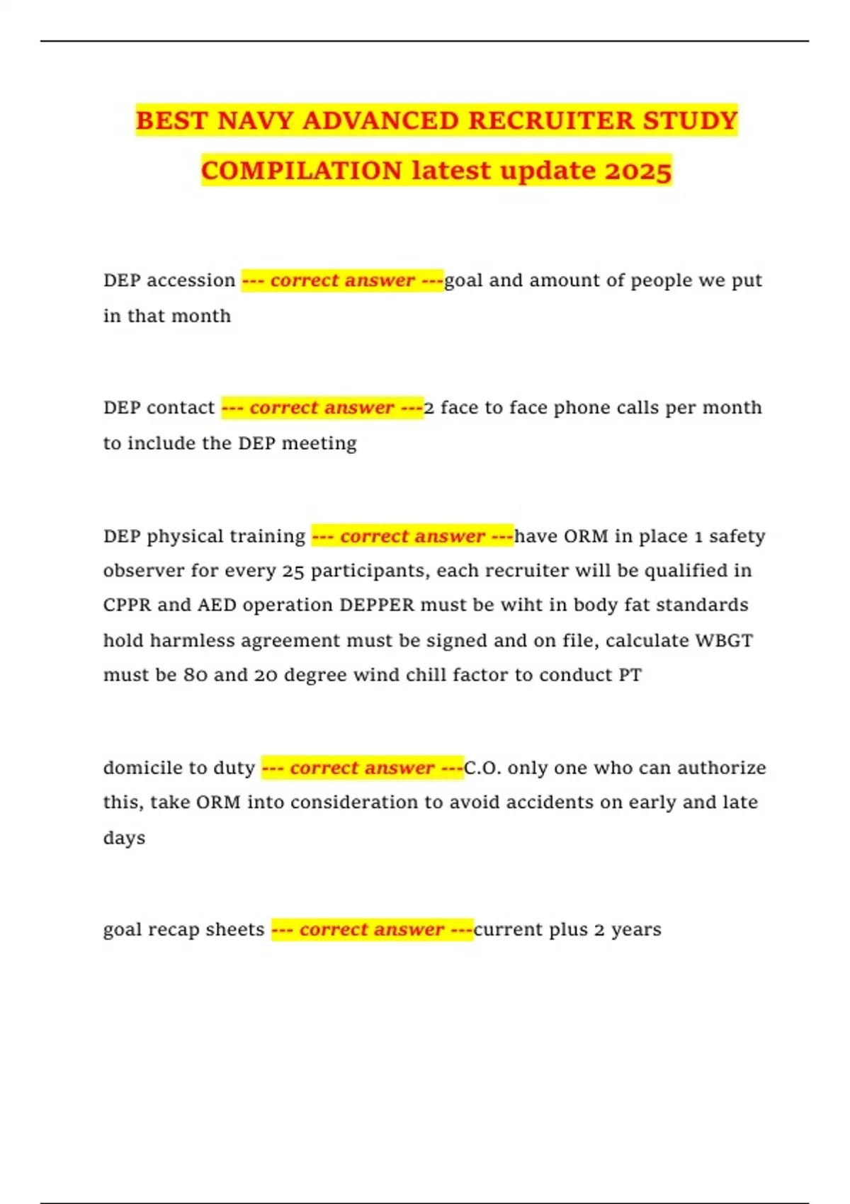 BEST NAVY ADVANCED RECRUITER STUDY COMPILATION latest update 2025 DEP accession --- correct answer ---goal and amount of people we put in that month DEP contact --- correct answer ---2 face to face phone calls per month to include the DEP meeting DEP physical training --- correct answer ---have ORM in place 1 safety observer for every 25 participants, each recruiter will be qualified in CPPR and AED operation DEPPER must be wiht in body fat standards hold harmless agreement must be signed and on file, calculate WBGT must be 80 and 20 degree wind chill factor to conduct PT domicile to duty --- correct answer ---C.O. only one who can authorize this, take ORM into consideration to avoid accidents on early and late days