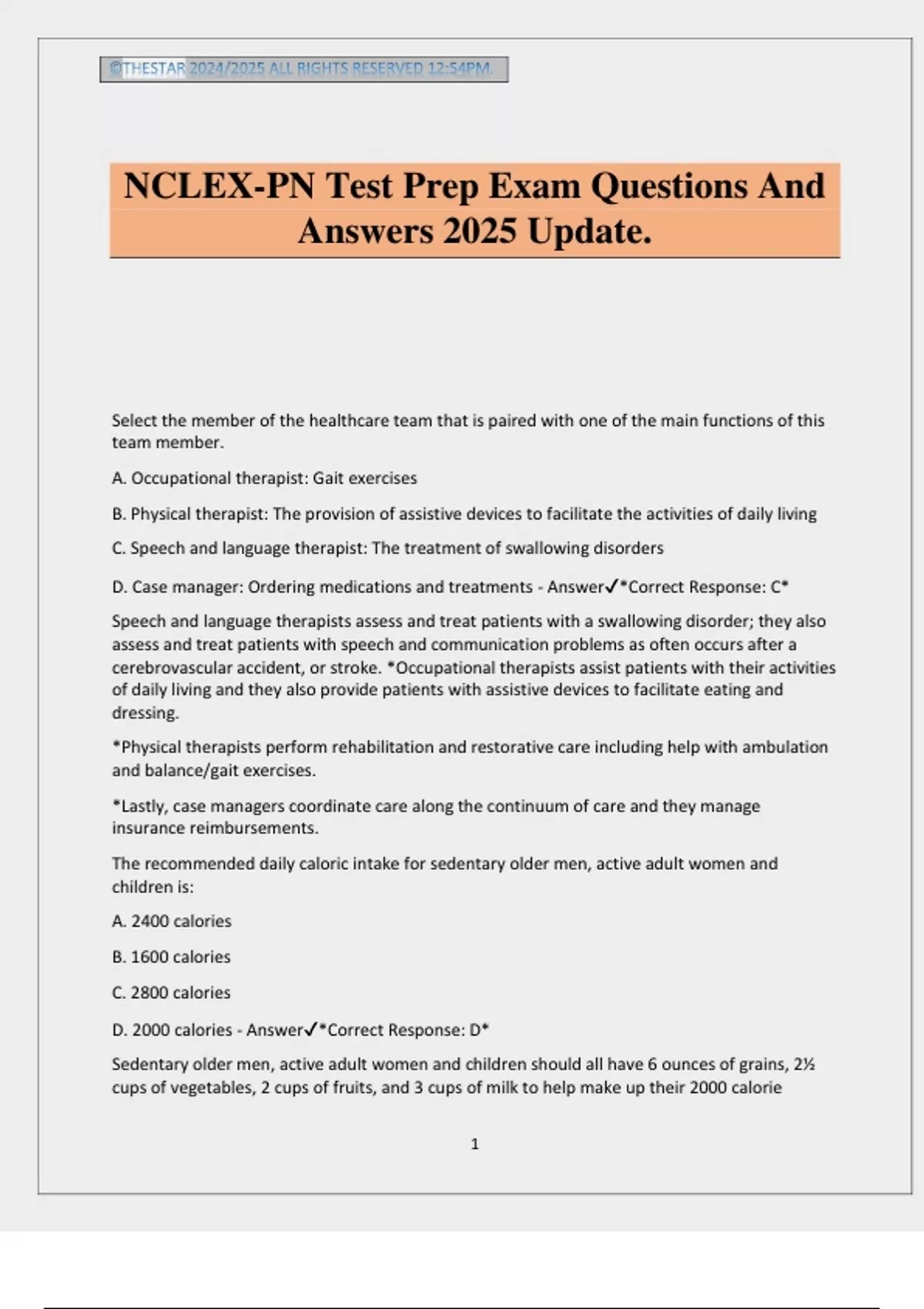 ©THESTAR 2024/2025 ALL RIGHTS RESERVED 12:54PM. 1 NCLEX-PN Test Prep Exam Questions And Answers 2025 Update. Select the member of the healthcare team that is paired with one of the main functions of this team member. A. Occupational therapist: Gait exercises B. Physical therapist: The provision of assistive devices to facilitate the activities of daily living C. Speech and language therapist: The treatment of swallowing disorders D. Case manager: Ordering medications and treatments - Answer*Correct Response: C* Speech and language therapists assess and treat patients with a swallowing disorder; they also assess and treat patients with speech and communication problems as often occurs after a cerebrovascular accident, or stroke. *Occupational therapists assist patients with their activities of daily living and they also provide patients with assistive devices to facilitate eating and dressing. *Physical therapists perform rehabilitation and restorative care including help with ambulation and balance/gait exercises. *Lastly, case managers coordinate care along the continuum of care and they manage insurance reimbursements. The recommended daily caloric intake for sedentary older men, active adult women and children is: A. 2400 calories B. 1600 calories C. 2800 calories D. 2000 calories - Answer*Correct Response: D* Sedentary older men, active adult women and children should all have 6 ounces of grains, 2½ cups of vegetables, 2 cups of fruits, and 3 cups of milk to help make up their 2000 calorie ©THESTAR 2024/2025 ALL RIGHTS RESERVED 12:54PM. 2 requirement. Sedentary adolescents require 2400 calories, sedentary women and children require 1600 calories and active adolescents need 2800 calories daily. Ill health, malnutrition, and wasting as a result of chronic disease are all associated with: A. Surgical asepsis B. Catabolism C. Cachexia D. Venous stasis - Answer*Correct Response: C* Ill health, malnutrition, and wasting as a result of chronic disease are all associated with cachexia. Cachexia can also result from dehiscence of a surgical incision or rupture of wound closure. *Surgical asepsis refers to using a sterile technique to protect against infection before, during, and after surgery. The breakdown of tissue, especially after severe trauma or crush injuries is known as *catabolism. *Venous stasis is a disorder related to pooling of blood in a vein of the body; venous stasis typically occurs in the lower extremities and it is one of the many hazards, or complications, of immobilization. Select all the possible opportunistic infections that adversely affect HIV/AIDS infected patients: A. Visual losses B. Kaposi's sarcoma C. Wilms' sarcoma D. Tuberculosis E. Peripheral neuropathy F. Toxoplasma gondii - Answer*Correct Response: B, D, F* Kaposi's sarcoma, tuberculosis, toxoplasma gondii, mycobacterium avium, herpes simplex, histoplasmosis and salmonella infections are HIV/AIDS associated opportunistic infections. *Although many affected patients can experience blindness and peripheral neuropathy, these disorders result from impaired nervous system damage rather than an infection. *Lastly, Wilms' tumor (sarcoma) is a pediatric form of kidney cancer and it is neither an infection nor something that typically affects the patient with HIV/AIDS What can help reduce a patient's anxiety and postsurgical pain? A. Preoperative teaching B. Preoperative checklist ©THESTAR 2024/2025 ALL RIGHTS RESERVED 12:54PM. 3 C. Psychological counseling D. Preoperative medication - Answer*Correct Response: A* Patient teaching before surgery not only helps to reduce a patient's anxiety and postsurgical pain but it also decreases the amount of anesthesia needed and a lack of anxiety additionally speeds up wound healing. Preoperative checklists are a form of nursing documentation that is used to guide and document the care of the patient before surgery. Psychological counseling is typically NOT necessary except under highly unusual circumstances and preoperative medication can decrease the amount of anesthetic needed and respiratory tract secretions but it does not help with postoperative pain. Which disease decreases the metabolic rate? A. Cancer B. Hypothyroidism C. Chronic obstructive pulmonary disease D. Cardiac failure - AnswerAnswer: B- hypothyroidism. When caring for an infant during cardiac arrest, which pulse must be palpated to determine cardiac function? A. Carotid B. Brachial C. Pedal D. Radial - AnswerBrachial (B). The patient after surgery should be sitting when deep breathing and coughing because this position: A. Is physically more comfortable for the patient B. Helps the patient to support their incision with a pillow C. Loosens respiratory secretions D. Allows the patient to observe their area and relax - AnswerSupports their incision! (B) Which procedures necessitate the use of surgical asepsis techniques? Select all that apply. A. Intramuscular medication administration B. Central line intravenous medication administration C. Donning gloves in t