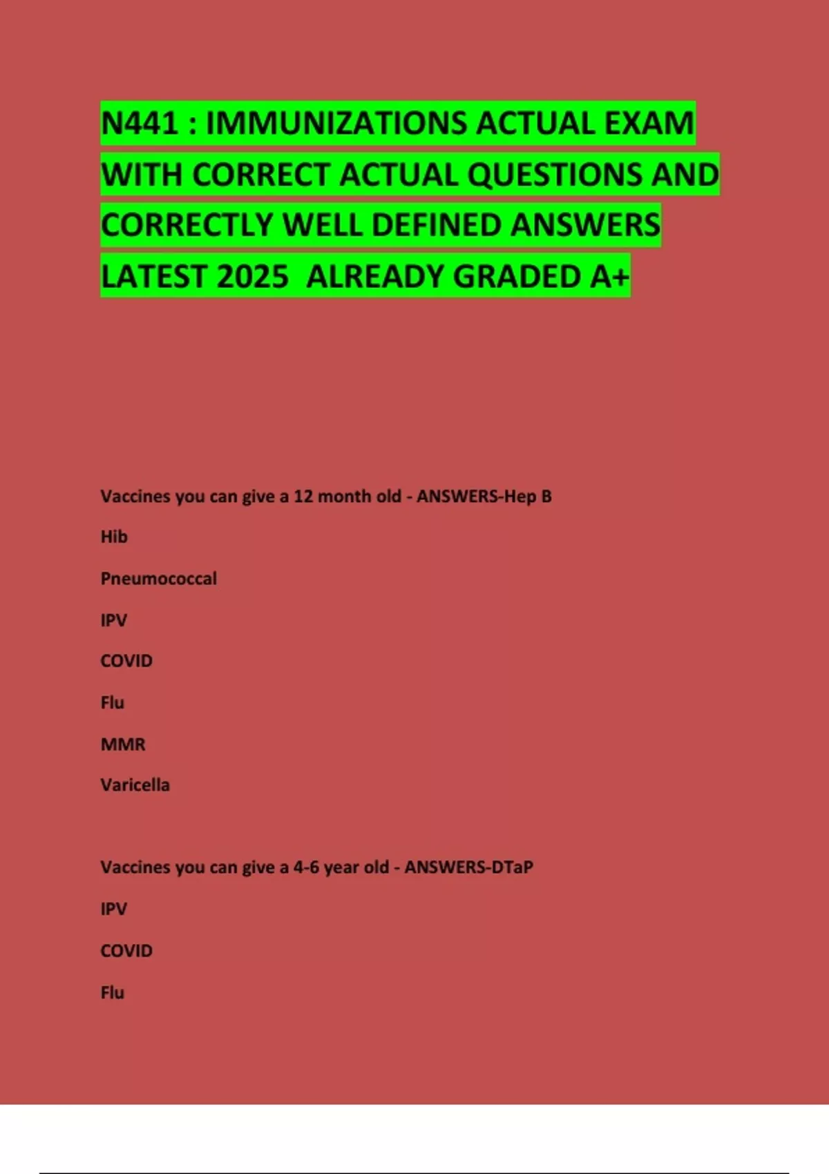 N441 : IMMUNIZATIONS ACTUAL EXAM WITH CORRECT ACTUAL QUESTIONS AND CORRECTLY WELL DEFINED ANSWERS LATEST 2025 ALREADY GRADED A+