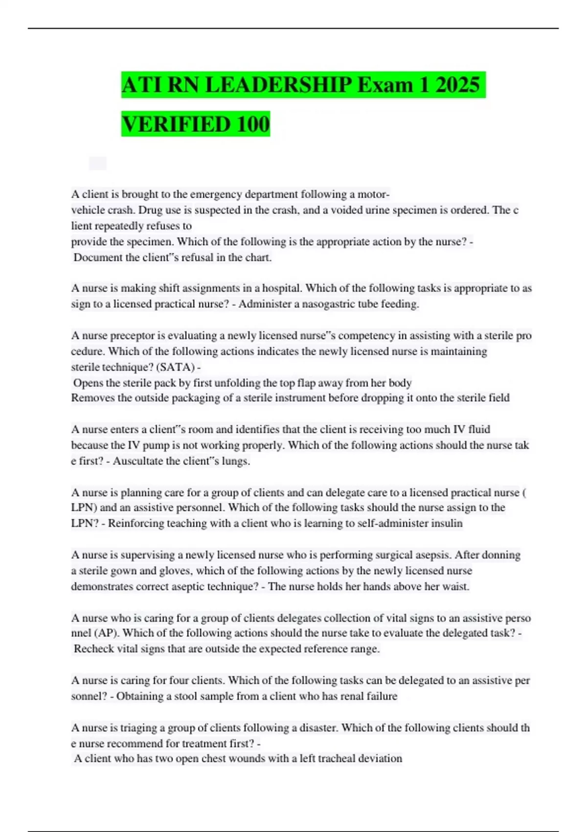 ATI RN LEADERSHIP Exam 1 2025