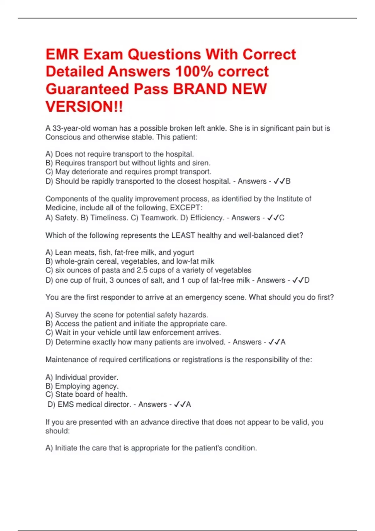 D) Should be rapidly transported to the closest hospital. - Answers - ✔✔B