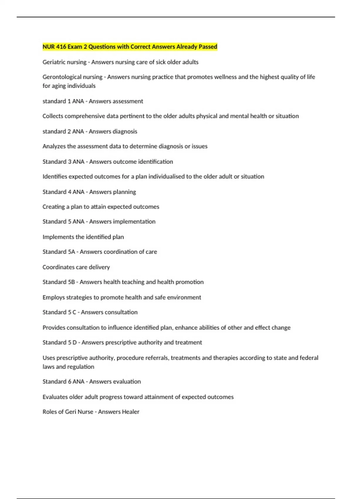 NUR 416 Exam 2 Questions with Correct Answers Already Passed Geriatric nursing - Answers nursing care of sick older adults Gerontological nursing - Answers nursing practice that promotes wellness and the highest quality of life for aging individuals standard 1 ANA - Answers assessment Collects comprehensive data pertinent to the older adults physical and mental health or situation standard 2 ANA - Answers diagnosis Analyzes the assessment data to determine diagnosis or issues Standard 3 ANA - Answers outcome identification Identifies expected outcomes for a plan individualised to the older adult or situation Standard 4 ANA - Answers planning Creating a plan to attain expected outcomes Standard 5 ANA - Answers implementation Implements the identified plan Standard 5A - Answers coordination of care Coordinates care delivery Standard 5B - Answers health teaching and health promotion Employs strategies to promote health and safe environment Standard 5 C - Answers consultation Provides consultation to influence identified plan, enhance abilities of other and effect change Standard 5 D - Answers prescriptive authority and treatment Uses prescriptive authority, procedure referrals, treatments and therapies according to state and federal laws and regulation Standard 6 ANA - Answers evaluation Evaluates older adult progress toward attainment of expected outcomes Roles of Geri Nurse - Answers Healer Caregiver Educator Advocate Innovator healer - Answers practice holistic nursing Must be viewed in the context of their biological, emotional, social, cultural and spiritual elements caregiver - Answers meet unique needs educator - Answers share knowledge and skills advocate - Answers speak up for older adults innovator - Answers "think outside the box" signs of elder abuse - Answers Delay in seeking necessary medical care Malnutrition Dehydration Unexplained bruises Poor hygiene and grooming Urine odor, urine stained clothing/ linens Excoriation or abrasions of genitalia Inappropriate administration of medications Repeated infections, injuries or preventable complications from existing disease Evasiveness in describing conditions, symptoms, problems and home life Unsafe living environment Social isolation Anxiety, suspiciousness and depression malpractice - Answers Provision of service in a competent manner with